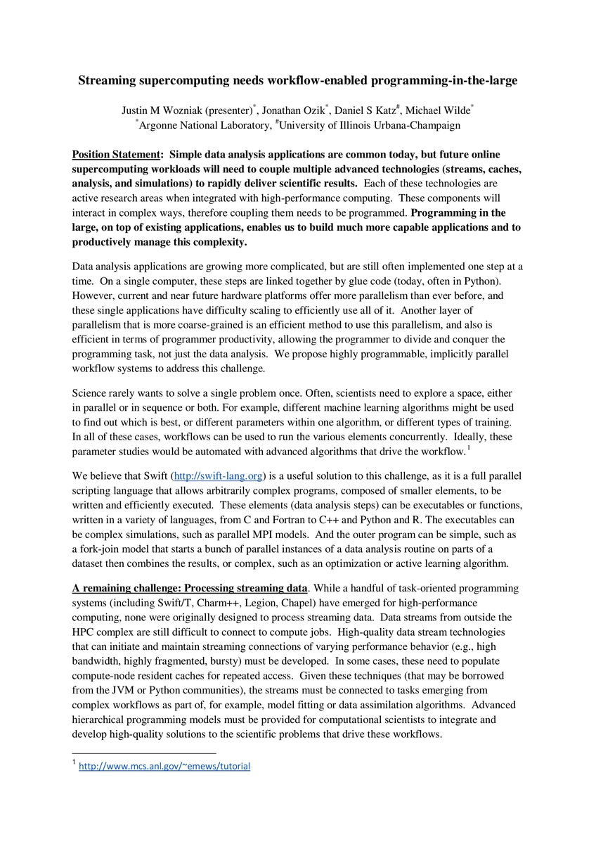 The paper presents a position advocating for workflow-enabled programming-in-the-large for streaming supercomputing, emphasizing the need to couple multiple advanced technologies like streams, caches, analysis, and simulations.