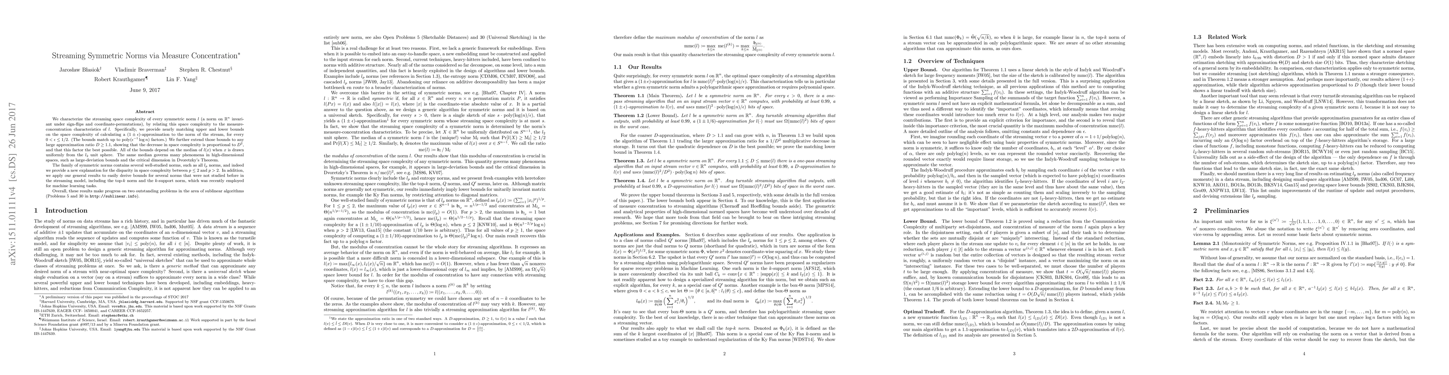 This paper characterizes the streaming space complexity for symmetric norms by linking it to measure concentration properties, providing nearly matching upper and lower bounds for approximating these norms. It also extends these bounds for larger approximation ratios, showing that space complexity decreases proportionally to the square of the ratio, which is optimal.