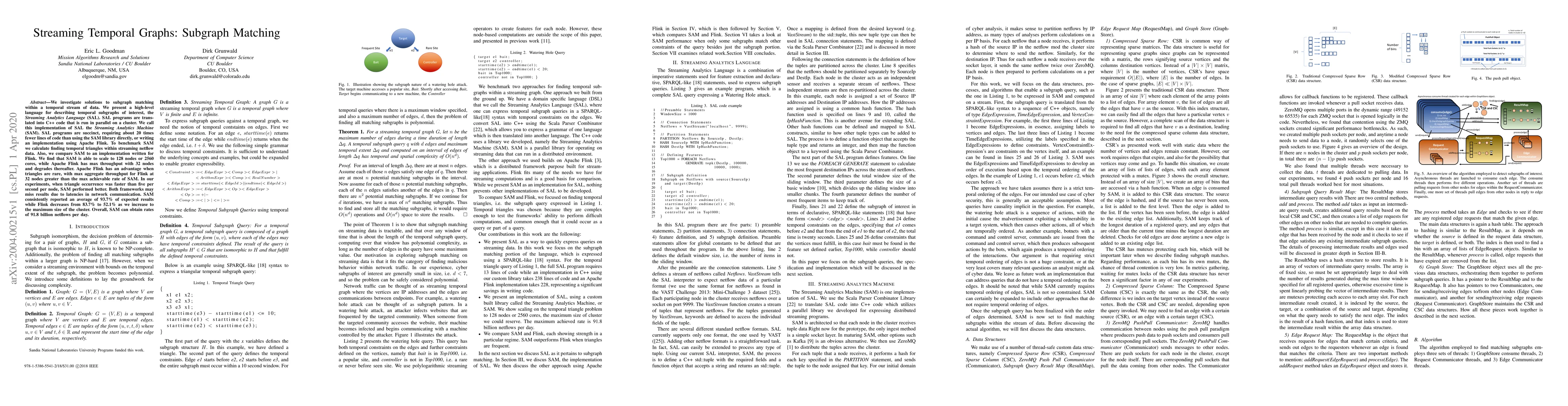 We investigate solutions to subgraph matching within a temporal stream of data. We present a high-level language for describing temporal subgraphs of interest, the Streaming Analytics Language (SAL). SAL programs are translated into C++ code that is run in parallel on a cluster. We call this implementation of SAL the Streaming Analytics Machine (SAM). SAL programs are succinct, requiring about 20 times fewer lines of code than using the SAM library directly, or writing an implementation using Apache Flink. To benchmark SAM we calculate finding temporal triangles within streaming netflow data. Also, we compare SAM to an implementation written for Flink. We find that SAM is able to scale to 128 nodes or 2560 cores, while Apache Flink has max throughput with 32 nodes and degrades thereafter. Apache Flink has an advantage when triangles are rare, with max aggregate throughput for Flink at 32 nodes greater than the max achievable rate of SAM. In our experiments, when triangle occurrence was faster than five per second per node, SAM performed better. Both frameworks may miss results due to latencies in network communication. SAM consistently reported an average of 93.7% of expected results while Flink decreases from 83.7% to 52.1% as we increase to the maximum size of the cluster. Overall, SAM can obtain rates of 91.8 billion netflows per day.