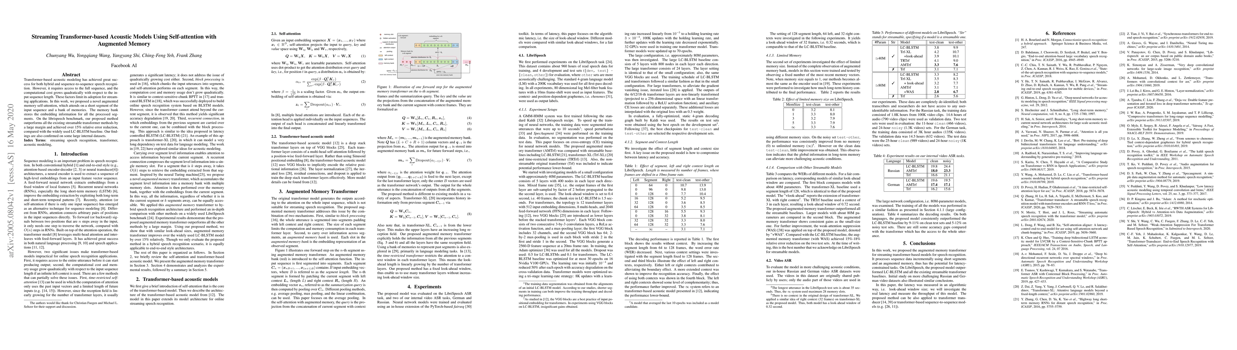 Transformer-based acoustic modeling has achieved great suc-cess for both hybrid and sequence-to-sequence speech recogni-tion. However, it requires access to the full sequence, and thecomputational cost grows quadratically with respect to the in-put sequence length. These factors limit its adoption for stream-ing applications. In this work, we proposed a novel augmentedmemory self-attention, which attends on a short segment of theinput sequence and a bank of memories. The memory bankstores the embedding information for all the processed seg-ments. On the librispeech benchmark, our proposed methodoutperforms all the existing streamable transformer methods bya large margin and achieved over 15% relative error reduction,compared with the widely used LC-BLSTM baseline. Our find-ings are also confirmed on some large internal datasets.