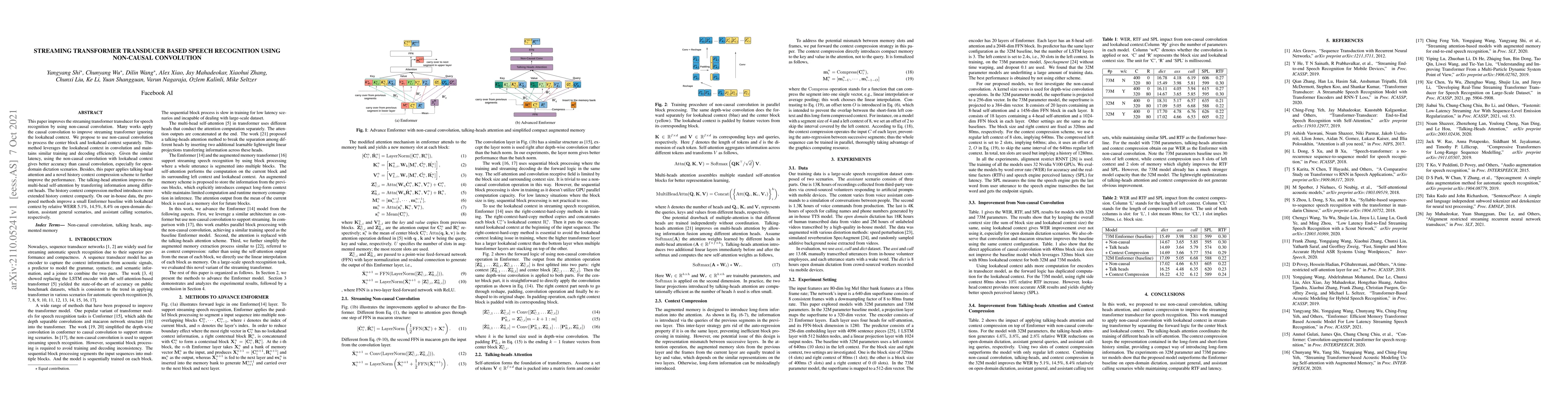 This paper enhances streaming transformer transducer speech recognition using non-causal convolution to leverage lookahead context, achieving better accuracy than causal convolution. It also introduces talking-head attention and history context compression, improving performance by 5.1%, 14.5%, and 8.4% respectively on various dictation and assistant scenarios.