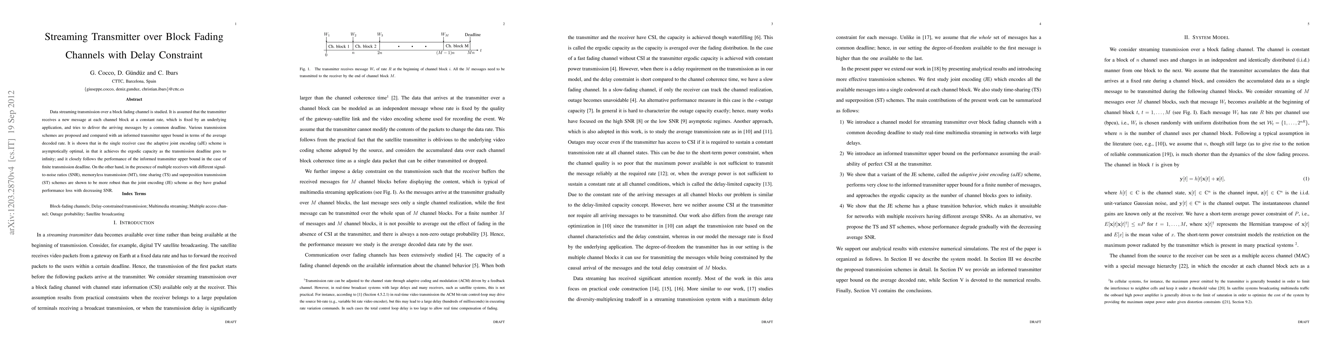 Data streaming transmission over a block fading channel is studied. It is assumed that the transmitter receives a new message at each channel block at a constant rate, which is fixed by an underlying application, and tries to deliver the arriving messages by a common deadline. Various transmission schemes are proposed and compared with an informed transmitter upper bound in terms of the average decoded rate. It is shown that in the single receiver case the adaptive joint encoding (aJE) scheme is asymptotically optimal, in that it achieves the ergodic capacity as the transmission deadline goes to infinity; and it closely follows the performance of the informed transmitter upper bound in the case of finite transmission deadline. On the other hand, in the presence of multiple receivers with different signal-to-noise ratios (SNR), memoryless transmission (MT), time sharing (TS) and superposition transmission (ST) schemes are shown to be more robust than the joint encoding (JE) scheme as they have gradual performance loss with decreasing SNR.