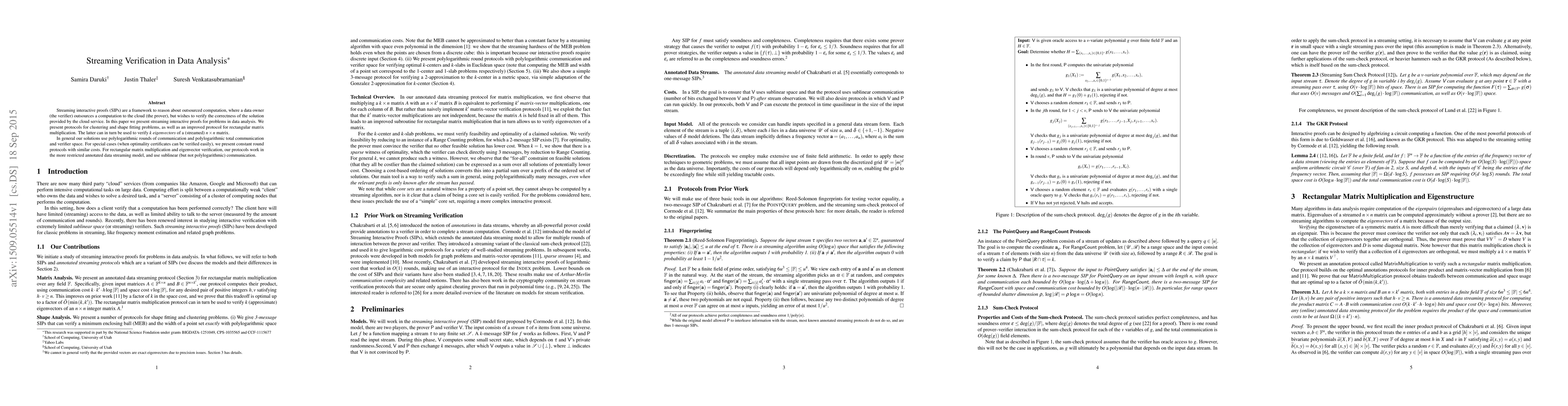 This paper introduces streaming interactive proofs for verifying outsourced computations in data analysis, focusing on clustering, shape fitting, and rectangular matrix multiplication. It presents efficient protocols with polylogarithmic communication rounds and space, and constant rounds for special cases, while achieving sublinear communication for specific tasks.