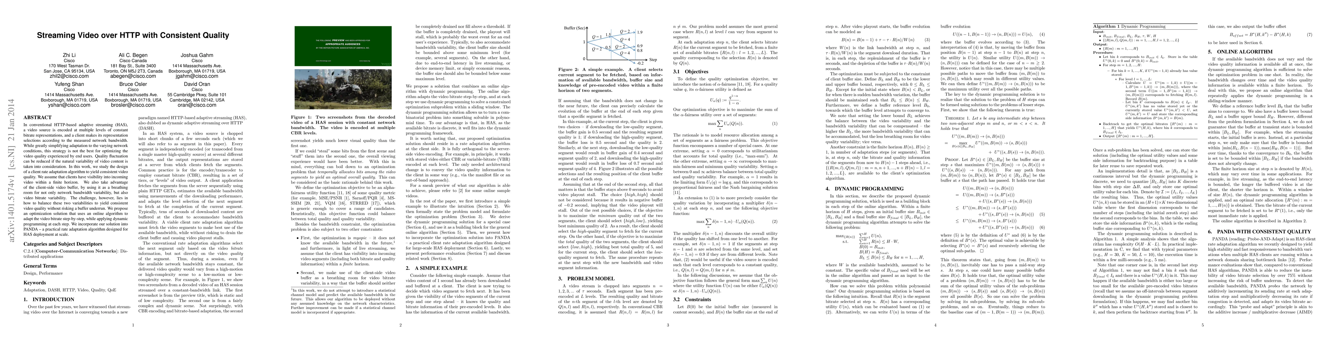 This paper proposes a client rate adaptation algorithm to achieve consistent video quality in HTTP-based adaptive streaming by balancing network and video bitrate variability, using dynamic programming and a client-side buffer. The solution is implemented in PANDA, a scalable rate adaptation algorithm for HAS.