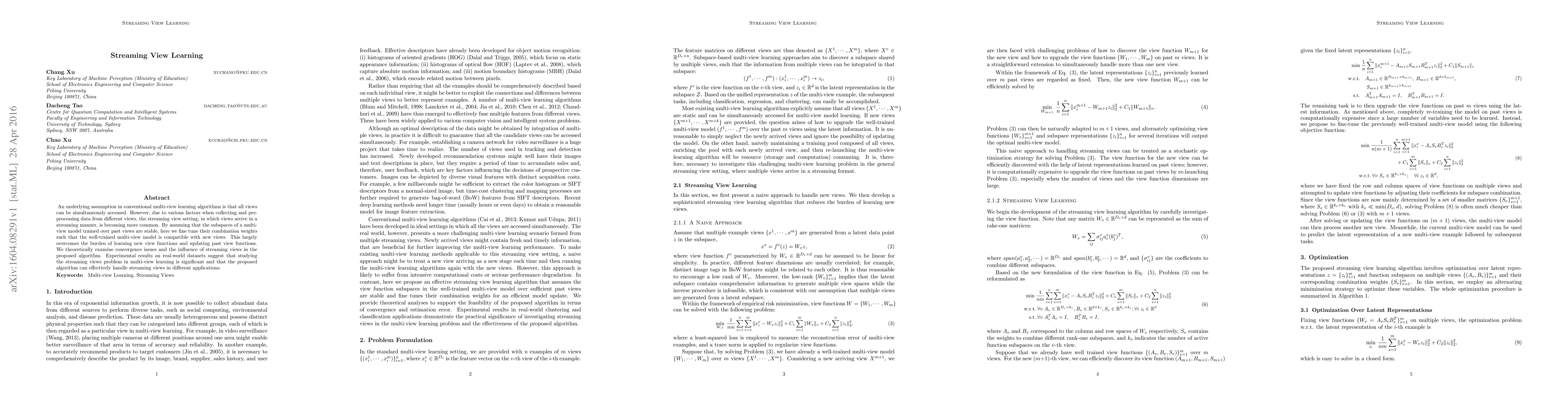 An underlying assumption in conventional multi-view learning algorithms is that all views can be simultaneously accessed. However, due to various factors when collecting and pre-processing data from different views, the streaming view setting, in which views arrive in a streaming manner, is becoming more common. By assuming that the subspaces of a multi-view model trained over past views are stable, here we fine tune their combination weights such that the well-trained multi-view model is compatible with new views. This largely overcomes the burden of learning new view functions and updating past view functions. We theoretically examine convergence issues and the influence of streaming views in the proposed algorithm. Experimental results on real-world datasets suggest that studying the streaming views problem in multi-view learning is significant and that the proposed algorithm can effectively handle streaming views in different applications.