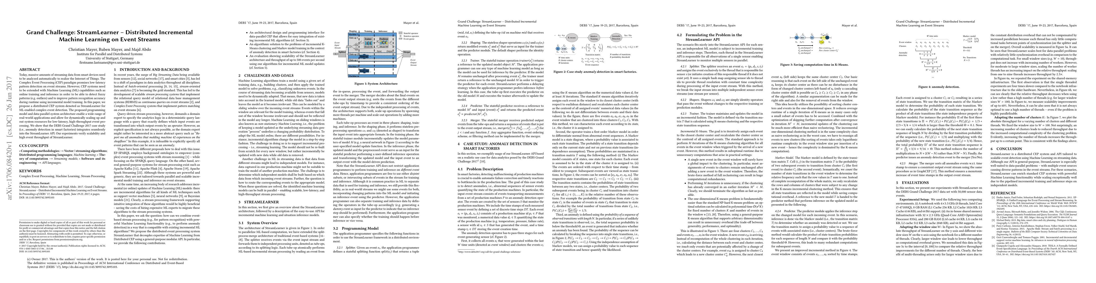 StreamLearner is a distributed system designed for incremental machine learning on event streams, enabling low-latency complex event processing. It integrates seamlessly with the DEBS Grand Challenge 2017 anomaly detection case study and demonstrates scalability and high throughput.
