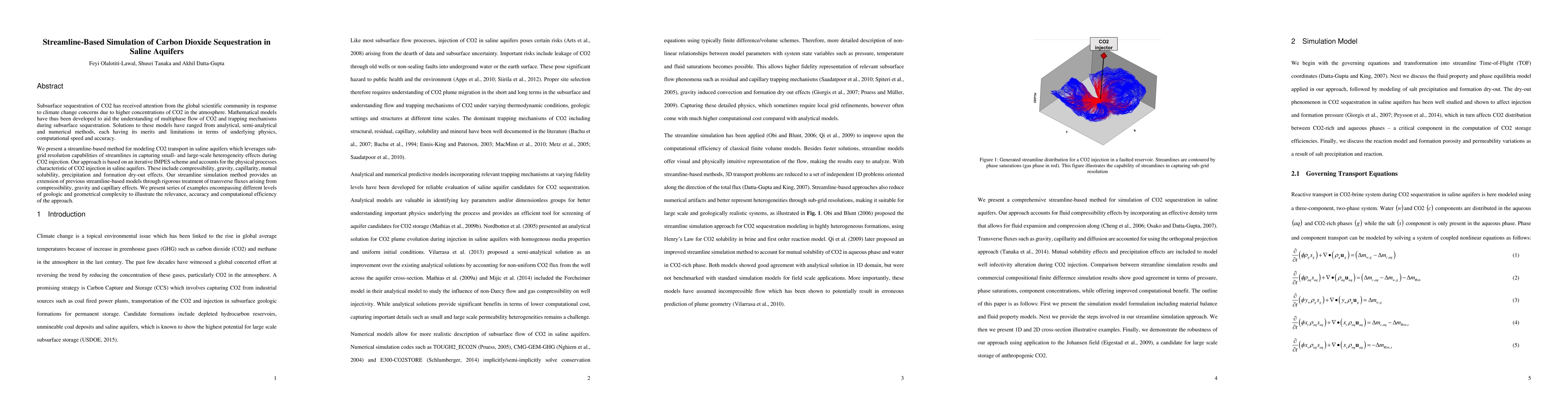 This paper introduces a streamline-based simulation method for modeling CO2 transport in saline aquifers, emphasizing its ability to capture heterogeneity effects and physical processes like compressibility and gravity. The method, based on an iterative IMPES scheme, demonstrates accuracy and computational efficiency through various complex examples.