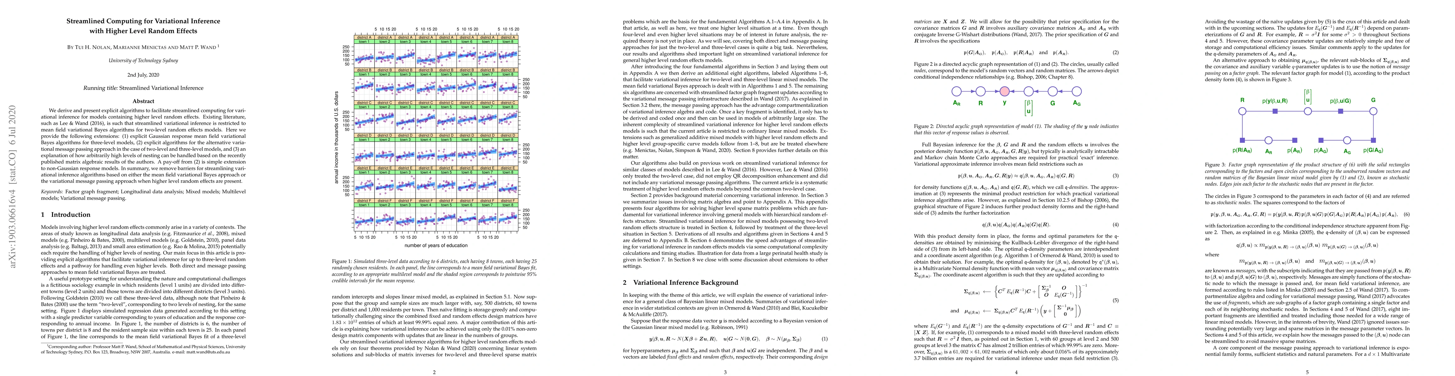 This paper develops explicit algorithms for streamlined variational inference in models with higher level random effects, extending existing methods to three-level models and enabling non-Gaussian response models through the variational message passing approach. The authors also demonstrate how the algorithms can handle arbitrarily high levels of nesting.