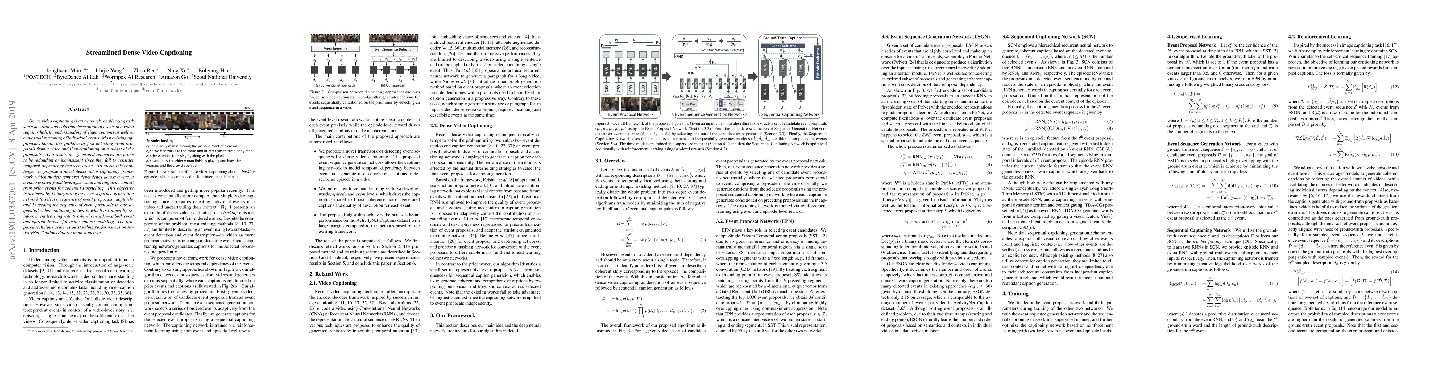This paper proposes a novel framework for dense video captioning that explicitly models temporal dependencies between events, integrating an adaptive event sequence generation network and a sequential captioning network trained with reinforcement learning for improved context modeling, achieving superior performance on the ActivityNet Captions dataset.