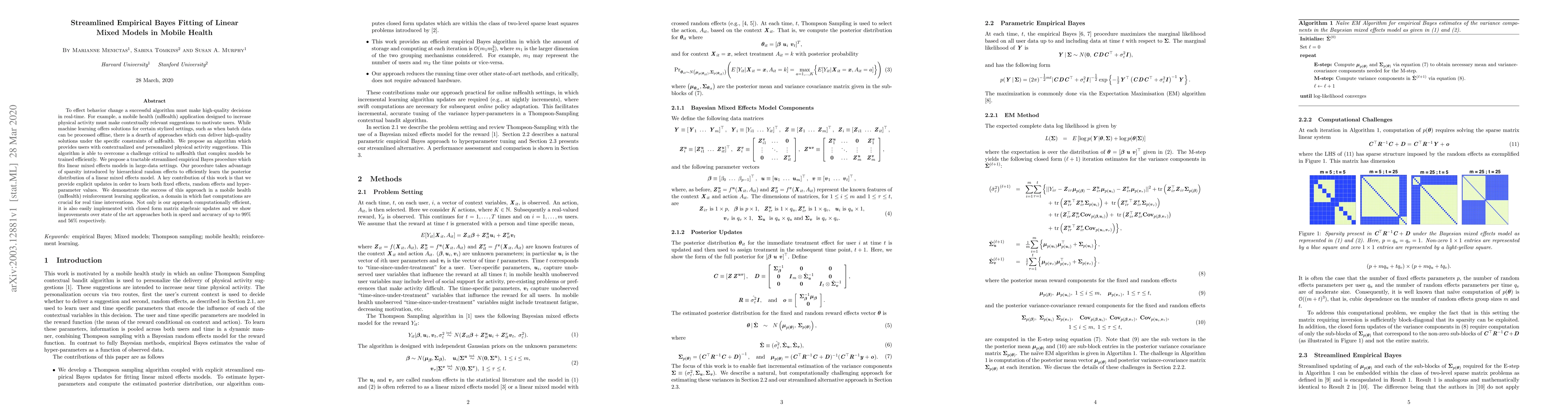 To effect behavior change a successful algorithm must make high-quality decisions in real-time. For example, a mobile health (mHealth) application designed to increase physical activity must make contextually relevant suggestions to motivate users. While machine learning offers solutions for certain stylized settings, such as when batch data can be processed offline, there is a dearth of approaches which can deliver high-quality solutions under the specific constraints of mHealth. We propose an algorithm which provides users with contextualized and personalized physical activity suggestions. This algorithm is able to overcome a challenge critical to mHealth that complex models be trained efficiently. We propose a tractable streamlined empirical Bayes procedure which fits linear mixed effects models in large-data settings. Our procedure takes advantage of sparsity introduced by hierarchical random effects to efficiently learn the posterior distribution of a linear mixed effects model. A key contribution of this work is that we provide explicit updates in order to learn both fixed effects, random effects and hyper-parameter values. We demonstrate the success of this approach in a mobile health (mHealth) reinforcement learning application, a domain in which fast computations are crucial for real time interventions. Not only is our approach computationally efficient, it is also easily implemented with closed form matrix algebraic updates and we show improvements over state of the art approaches both in speed and accuracy of up to 99% and 56% respectively.
