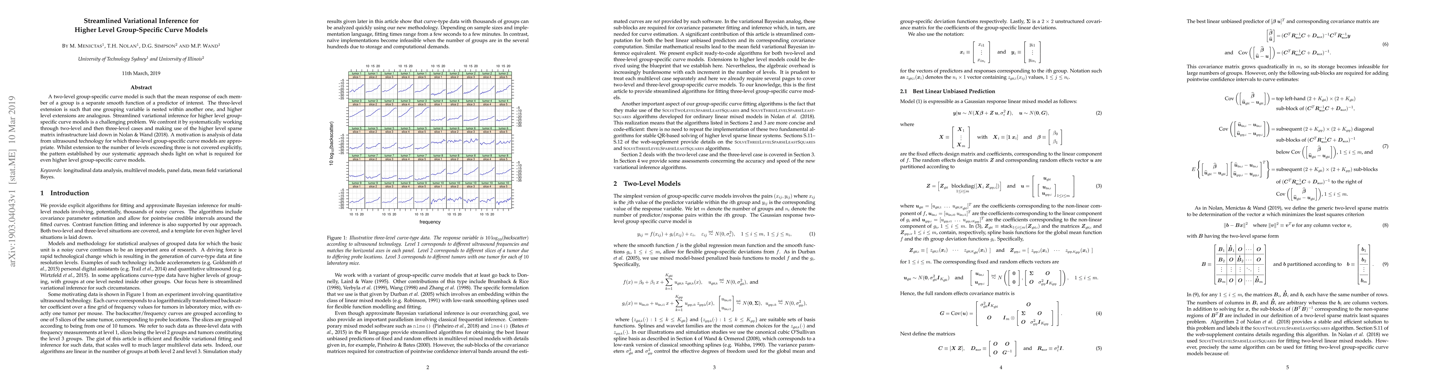 This paper proposes a streamlined variational inference method for higher level group-specific curve models, systematically addressing two-level and three-level cases using sparse matrix infrastructure. The approach is motivated by the analysis of ultrasound data, providing insights for extending the method to even more levels.