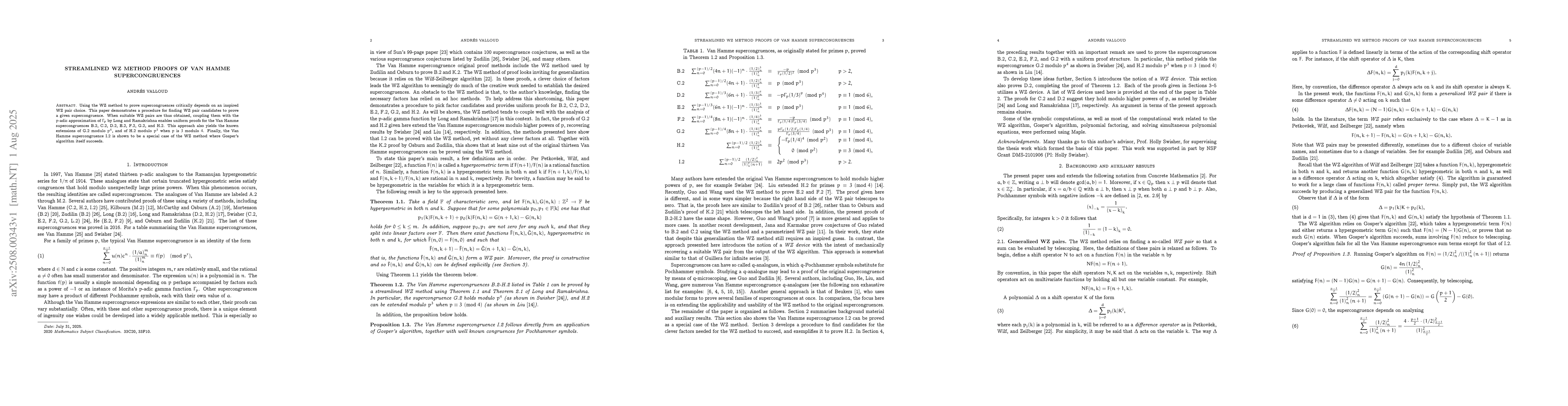 Using the WZ method to prove supercongruences critically depends on an inspired WZ pair choice. This paper demonstrates a procedure for finding WZ pair candidates to prove a given supercongruence. When suitable WZ pairs are thus obtained, coupling them with the $p$-adic approximation of $\Gamma_p$ by Long and Ramakrishna enables uniform proofs for the Van Hamme supercongruences B.2, C.2, D.2, E.2, F.2, G.2, and H.2. This approach also yields the known extensions of G.2 modulo $p^4$, and of H.2 modulo $p^3$ when $p$ is $3$ modulo $4$. Finally, the Van Hamme supercongruence I.2 is shown to be a special case of the WZ method where Gosper's algorithm itself succeeds.