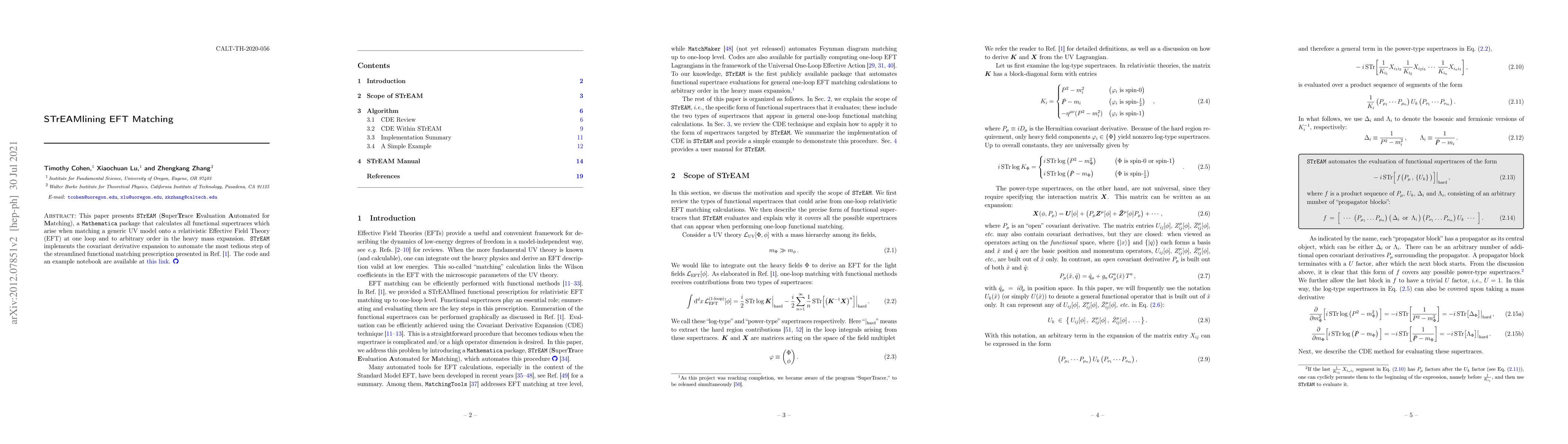 STrEAM is a Mathematica package designed to automate the calculation of functional supertraces in matching UV models to relativistic EFTs at one loop and beyond. It employs the covariant derivative expansion to streamline the matching process.