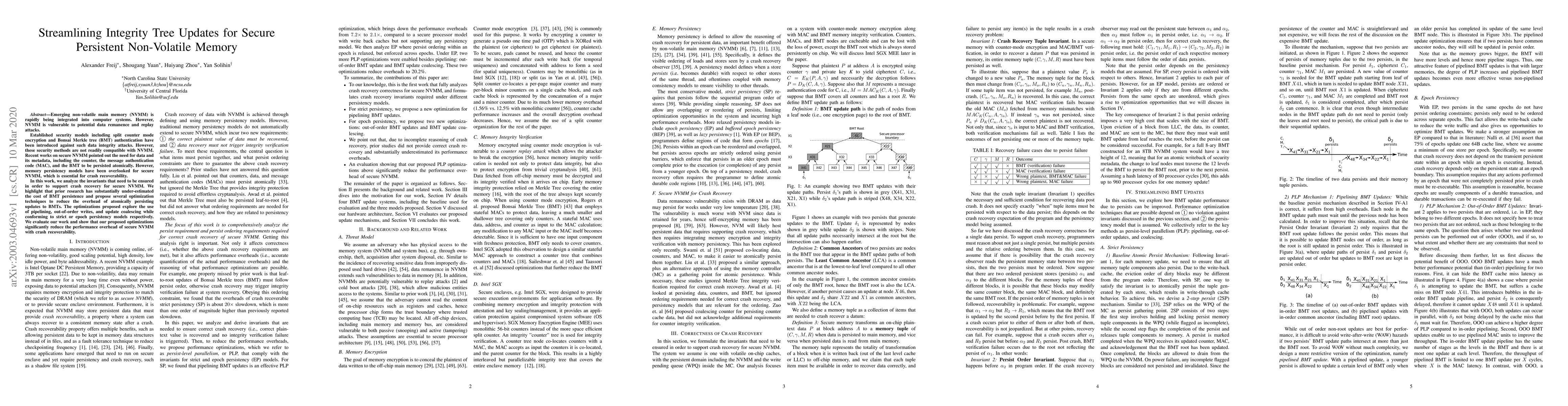 This paper addresses the challenge of updating integrity trees in non-volatile memory systems to ensure security against data integrity attacks while maintaining crash recoverability. It proposes optimization techniques like pipelining and update coalescing to reduce the overhead of persisting updates, significantly improving performance.
