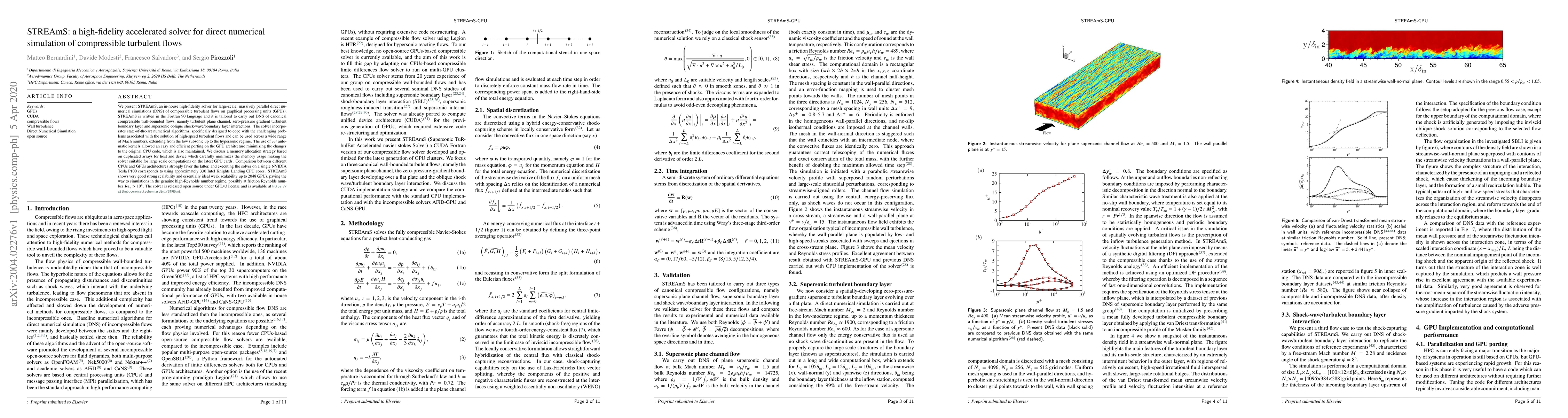 STREAmS is a high-fidelity solver for direct numerical simulations of compressible turbulent flows, optimized for GPU performance and designed for large-scale simulations. It demonstrates excellent scalability and efficiency on GPUs, enabling simulations at high Reynolds numbers.