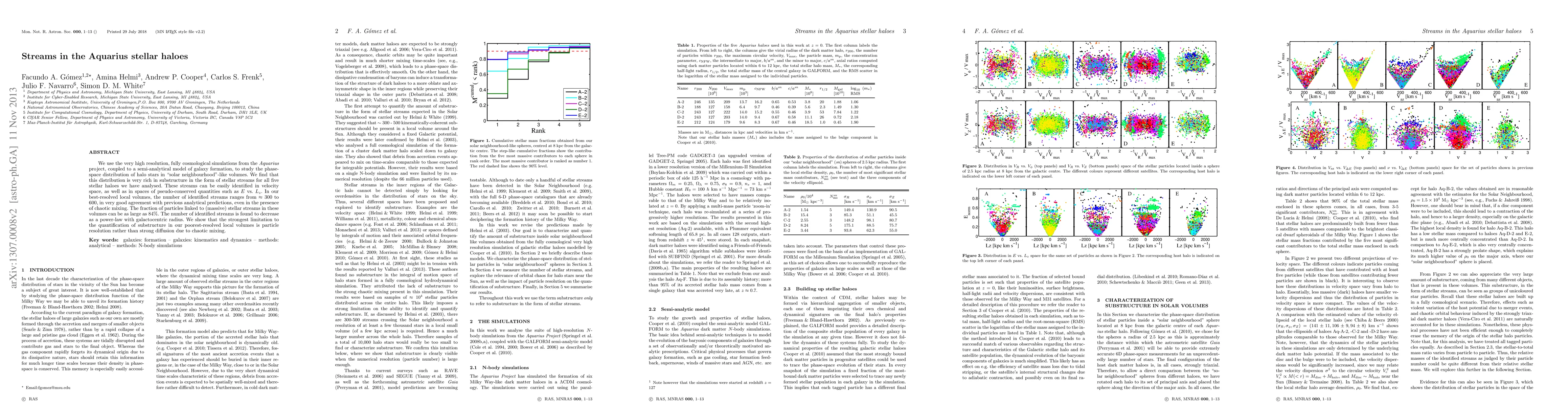 This paper uses high-resolution Aquarius simulations to study stellar streams in the Aquarius stellar haloes, finding a rich substructure in the form of streams that can be identified in velocity and pseudo-conserved quantity spaces. The number of streams ranges from 300 to 600, with up to 84% of particles linked to these streams, and particle resolution is the main limitation in less resolved volumes.