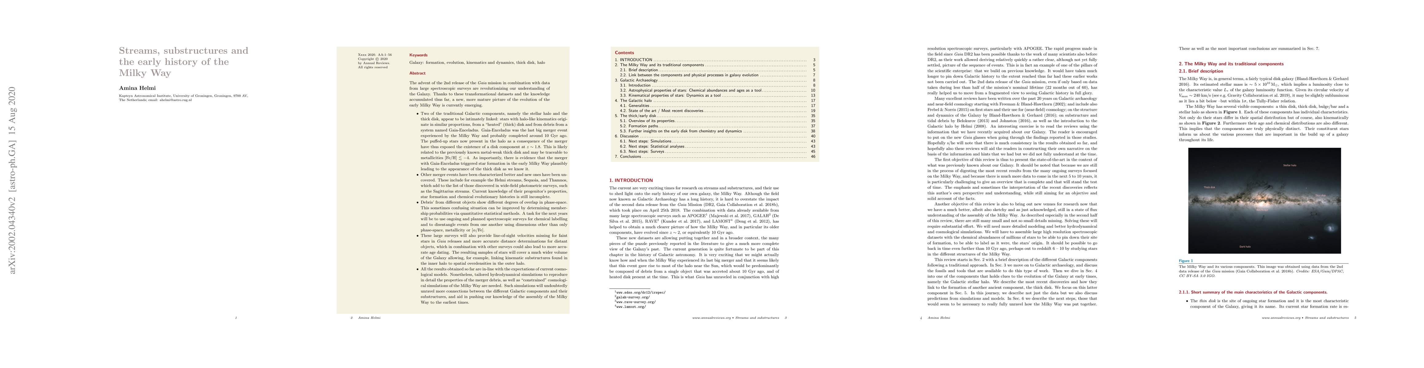 The advent of Gaia's 2nd data release in combination with large spectroscopic surveys are revolutionizing our understanding of the Galaxy. Thanks to these and the knowledge accumulated thus far, a more mature picture of the evolution of the early Milky Way is emerging: * Two of the traditional Galactic components, i.e. the stellar halo and the thick disk, appear to be intimately linked: stars with halo-like kinematics originate in similar proportions, from a "heated" (thick) disk and from debris from a system named Gaia-Enceladus. Gaia-Enceladus was the last big merger event experienced by the Milky Way and probably completed around 10 Gyr ago. The puffed-up stars now present in the halo as a consequence of the merger have thus exposed the existence of a disk component at z ~ 1.8. * The Helmi streams, Sequoia, and Thamnos are amongst the newly uncovered or better characterized merger events. Knowledge of their progenitor's properties, star formation and chemical histories is still incomplete. * Debris' from different objects often overlap in phase-space. A task for the next years will be to use spectroscopic surveys for chemical labelling and to disentangle events from one another using dimensions other than only phase-space, metallicity or [alpha/Fe]. * These surveys will also provide line-of-sight velocities missing for faint stars and more accurate distance determinations for distant objects. The resulting samples of stars will cover a much wider volume of the Galaxy allowing, for example, linking kinematic substructures in the inner halo to spatial overdensities in the outer halo. * All the results obtained so far are in-line with expectations of current cosmological models. Yet, tailored hydrodynamical simulations as well as "constrained" cosmological simulations are needed to push our knowledge of the assembly of the Milky Way back to the earliest times. [abridged]