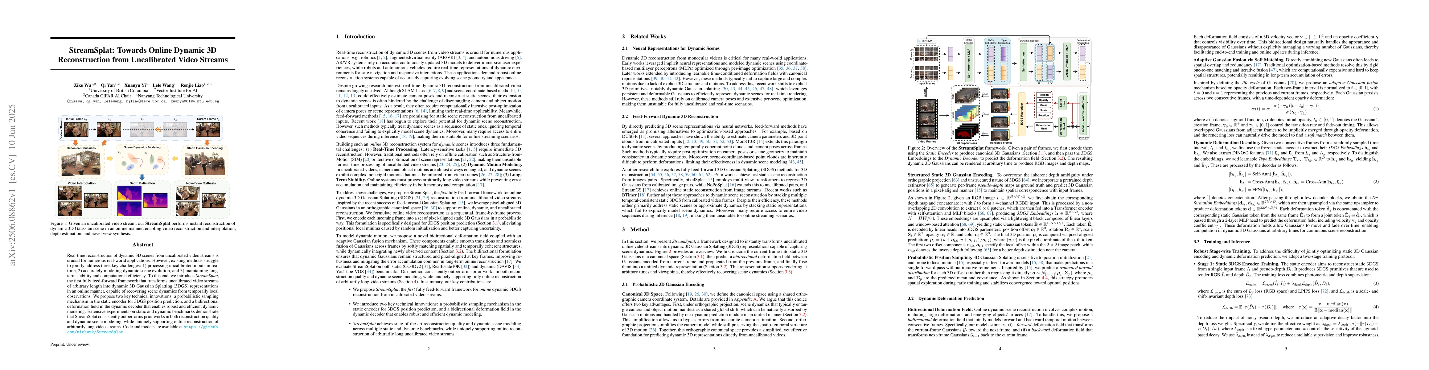 StreamSplat offers a novel online 3D reconstruction framework from uncalibrated video streams, outperforming prior works in both quality and dynamic scene modeling.