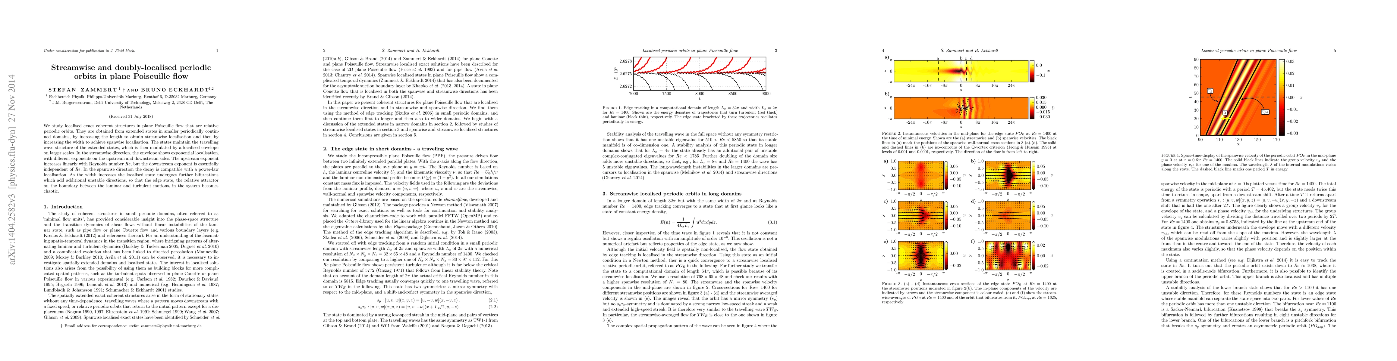 This paper explores localised periodic orbits in plane Poiseuille flow, revealing streamwise and spanwise localisation through exponential and power-law decay respectively. The upstream localisation exponent increases with Reynolds number, while the downstream remains constant, leading to chaotic bifurcations at larger widths.