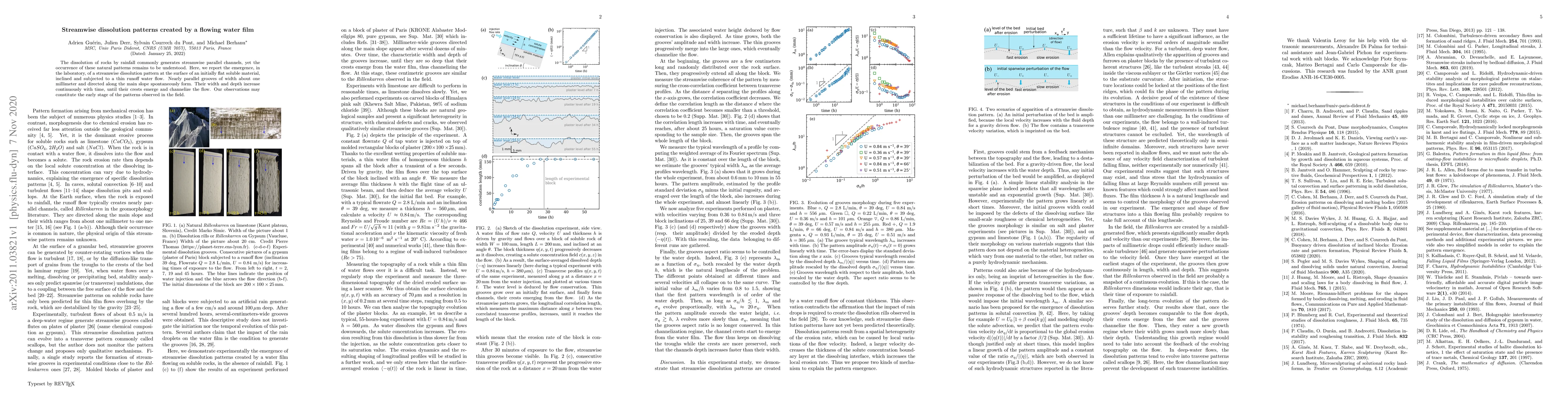 The dissolution of rocks by rainfall commonly generates streamwise parallel channels, yet the occurrence of these natural patterns remains to be understood. Here, we report the emergence in the laboratory of a streamwise dissolution pattern at the surface of an initially flat soluble material, inclined and subjected to a thin runoff water flow. Nearly parallel grooves about 1 mm wide and directed along the main slope spontaneously form. Their width and depth increase continuously with time until their crests emerge and channelize the flow. Our observations may constitute the early stage of the patterns observed in the field.