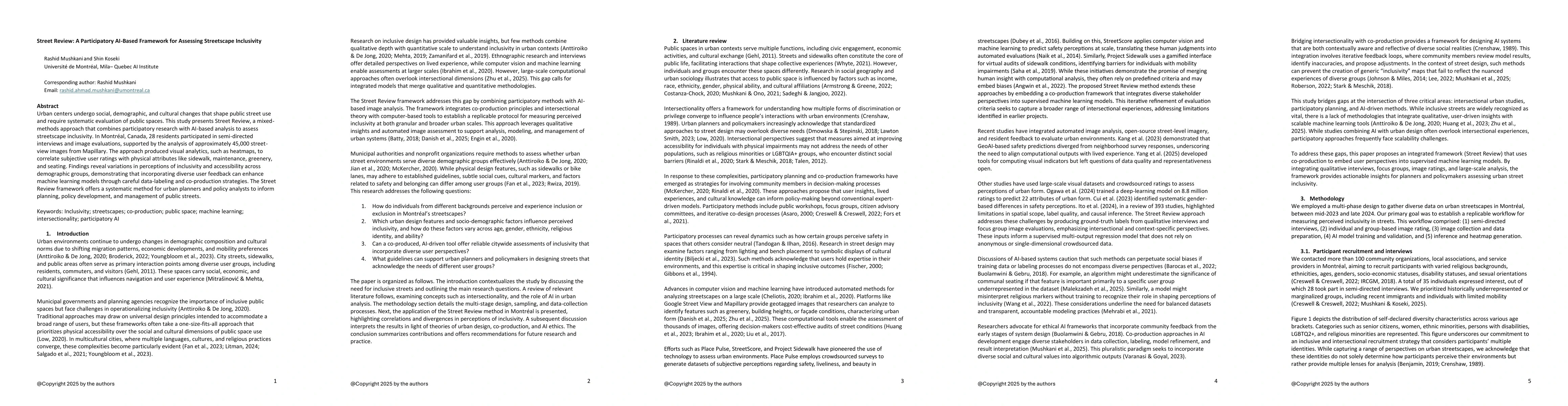 Urban centers undergo social, demographic, and cultural changes that shape public street use and require systematic evaluation of public spaces. This study presents Street Review, a mixed-methods approach that combines participatory research with AI-based analysis to assess streetscape inclusivity. In Montr\'eal, Canada, 28 residents participated in semi-directed interviews and image evaluations, supported by the analysis of approximately 45,000 street-view images from Mapillary. The approach produced visual analytics, such as heatmaps, to correlate subjective user ratings with physical attributes like sidewalk, maintenance, greenery, and seating. Findings reveal variations in perceptions of inclusivity and accessibility across demographic groups, demonstrating that incorporating diverse user feedback can enhance machine learning models through careful data-labeling and co-production strategies. The Street Review framework offers a systematic method for urban planners and policy analysts to inform planning, policy development, and management of public streets.