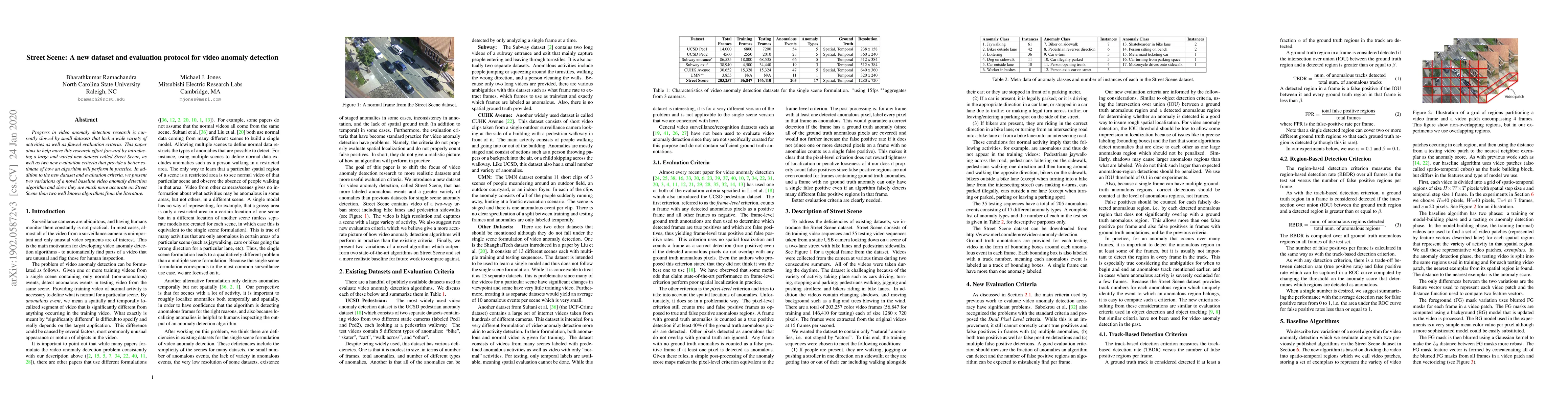 Progress in video anomaly detection research is currently slowed by small datasets that lack a wide variety of activities as well as flawed evaluation criteria. This paper aims to help move this research effort forward by introducing a large and varied new dataset called Street Scene, as well as two new evaluation criteria that provide a better estimate of how an algorithm will perform in practice. In addition to the new dataset and evaluation criteria, we present two variations of a novel baseline video anomaly detection algorithm and show they are much more accurate on Street Scene than two state-of-the-art algorithms from the literature.