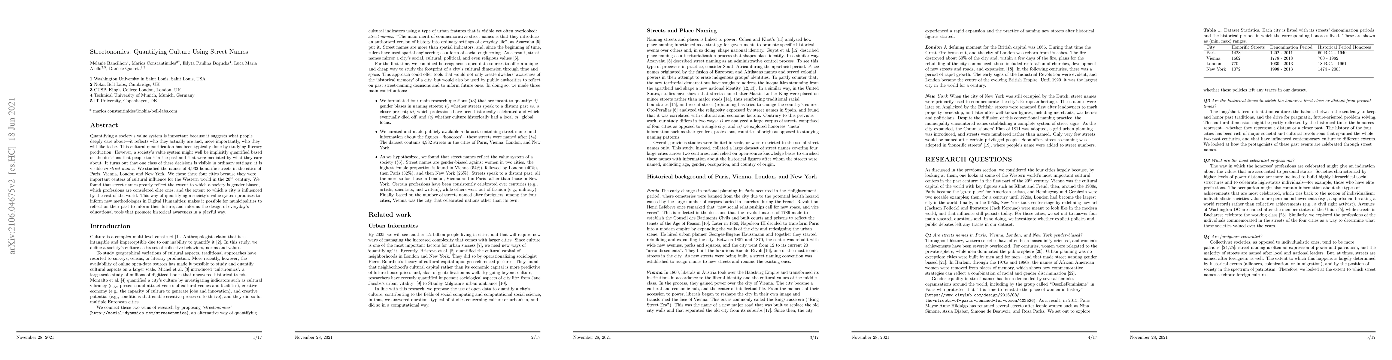 Quantifying a society's value system is important because it suggests what people deeply care about -- it reflects who they actually are and, more importantly, who they will like to be. This cultural quantification has been typically done by studying literary production. However, a society's value system might well be implicitly quantified based on the decisions that people took in the past and that were mediated by what they care about. It turns out that one class of these decisions is visible in ordinary settings: it is visible in street names. We studied the names of 4,932 honorific streets in the cities of Paris, Vienna, London and New York. We chose these four cities because they were important centers of cultural influence for the Western world in the 20th century. We found that street names greatly reflect the extent to which a society is gender biased, which professions are considered elite ones, and the extent to which a city is influenced by the rest of the world. This way of quantifying a society's value system promises to inform new methodologies in Digital Humanities; makes it possible for municipalities to reflect on their past to inform their future; and informs the design of everyday's educational tools that promote historical awareness in a playful way.