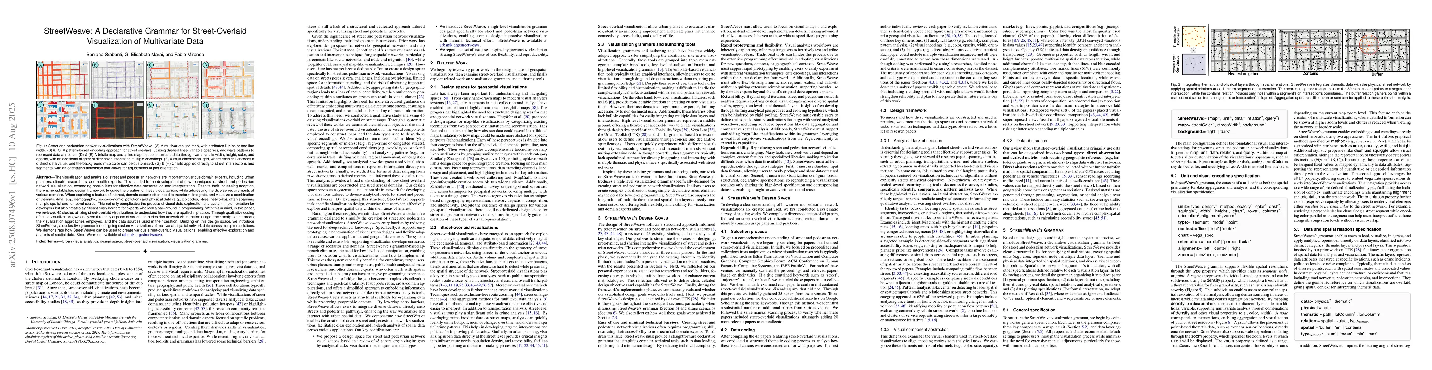 The paper reviewed 45 studies on street-overlaid visualizations, coding them based on analytical tasks, visualization approaches, and data sources. A declarative grammar, StreetWeave, was developed for designing custom visualizations of multivariate spatial network data.
