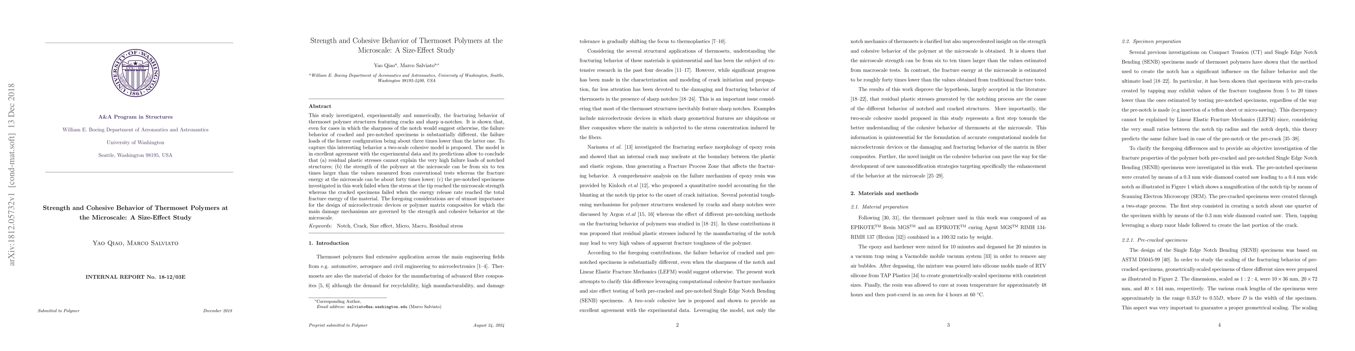 This study experimentally and numerically examines the differing failure behaviors of thermoset polymer structures with cracks versus sharp notches, revealing that notched specimens have significantly higher failure loads. A two-scale cohesive model is proposed to explain these observations, highlighting that microscale strength is much greater than conventional measurements suggest, and the failure mechanisms differ based on stress and energy release rate.