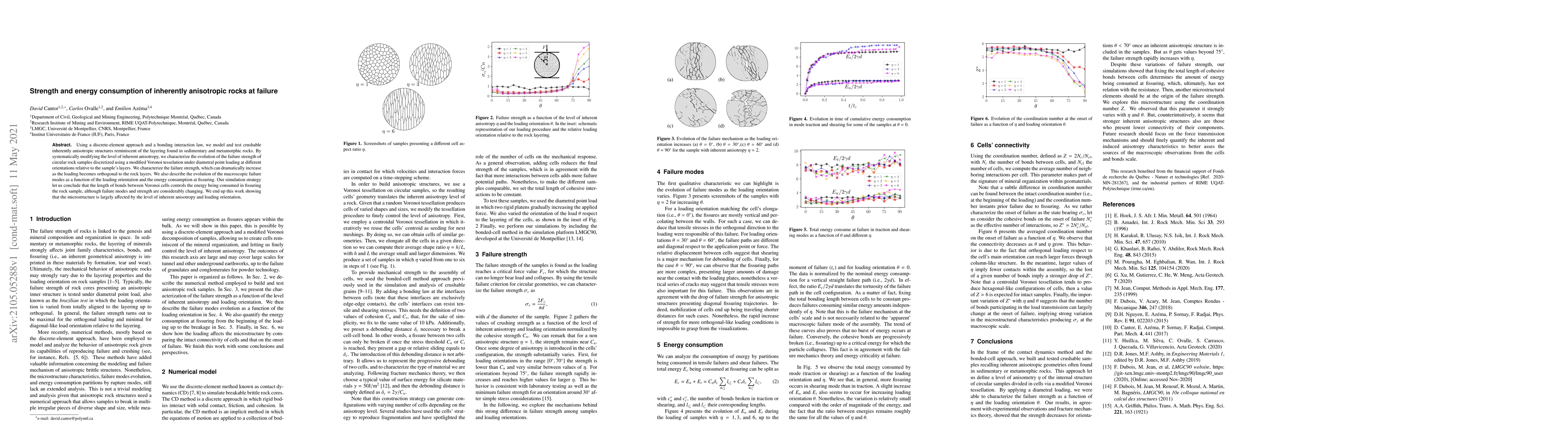Using a discrete-element approach and a bonding interaction law, we model and test crushable inherently anisotropic structures reminiscent of the layering found in sedimentary and metamorphic rocks. By systematically modifying the level of inherent anisotropy, we characterize the evolution of the failure strength of circular rock samples discretized using a modified Voronoi tesselation under diametral point loading at different orientations relative to the sample's layers. We characterize the failure strength, which can dramatically increase as the loading becomes orthogonal to the rock layers. We also describe the evolution of the macroscopic failure modes as a function of the loading orientation and the energy consumption at fissuring. Our simulation strategy let us conclude that the length of bonds between Voronoi cells controls the energy being consumed in fissuring the rock sample, although failure modes and strength are considerably changing. We end up this work showing that the microstructure is largely afected by the level of inherent anisotropy and loading orientation.