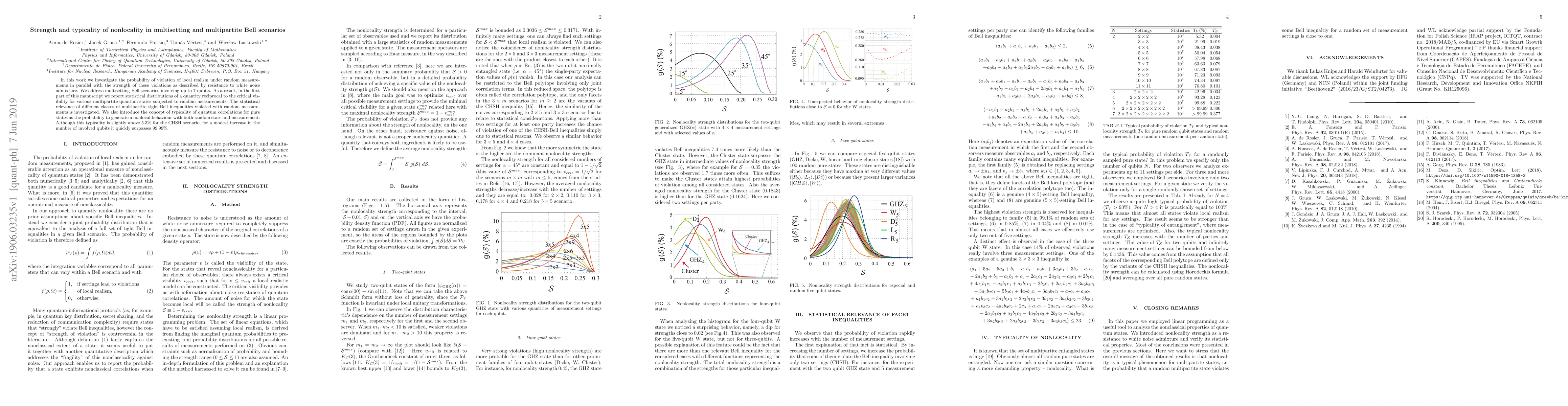 In this work we investigate the probability of violation of local realism under random measurements in parallel with the strength of these violations as described by resistance to white noise admixture. We address multisetting Bell scenarios involving up to 7 qubits. As a result, in the first part of this manuscript we report statistical distributions of a quantity reciprocal to the critical visibility for various multipartite quantum states subjected to random measurements. The statistical relevance of different classes of multipartite tight Bell inequalities violated with random measurements is investigated. We also introduce the concept of typicality of quantum correlations for pure states as the probability to generate a nonlocal behaviour with both random state and measurement. Although this typicality is slightly above 5.3\% for the CHSH scenario, for a modest increase in the number of involved qubits it quickly surpasses 99.99\%.