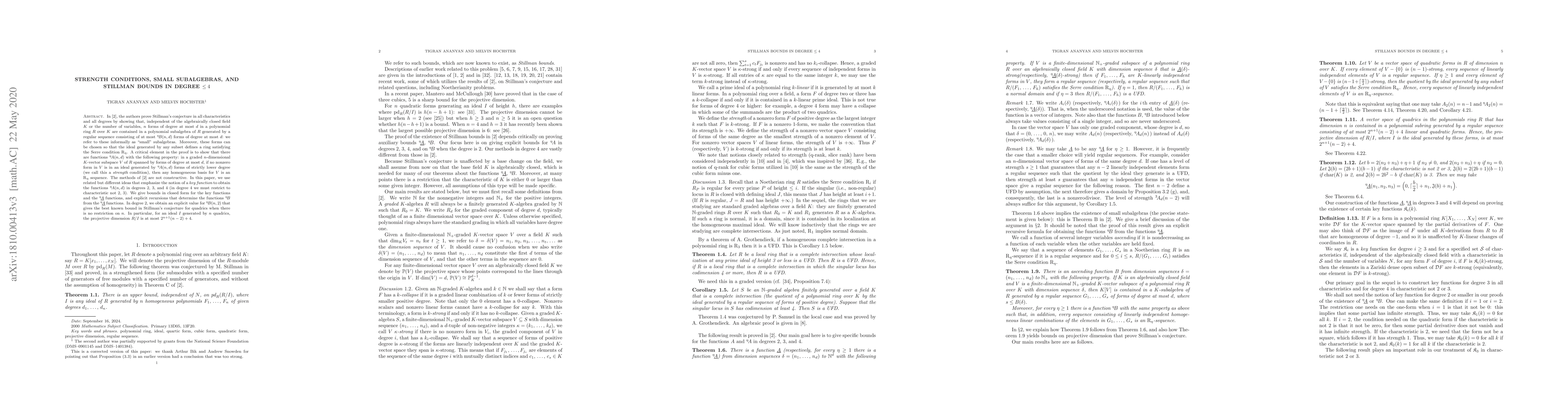 In [2], the authors prove Stillman's conjecture in all characteristics and all degrees by showing that, independent of the algebraically closed field $K$ or the number of variables, $n$ forms of degree at most $d$ in a polynomial ring $R$ over $K$ are contained in a polynomial subalgebra of $R$ generated by a regular sequence consisting of at most ${}^\eta\!B(n,d)$ forms of degree at most $d$: we refer to these informally as "small" subalgebras. Moreover, these forms can be chosen so that the ideal generated by any subset defines a ring satisfying the Serre condition R$_\eta$. A critical element in the proof is to show that there are functions ${}^\eta\!A(n,d)$ with the following property: in a graded $n$-dimensional $K$-vector subspace $V$ of $R$ spanned by forms of degree at most $d$, if no nonzero form in $V$ is in an ideal generated by ${}^\eta\!A(n,d)$ forms of strictly lower degree (we call this a {\it strength} condition), then any homogeneous basis for $V$ is an R$_\eta$ sequence. The methods of \cite{AH2} are not constructive. In this paper, we use related but different ideas that emphasize the notion of a {\it key function} to obtain the functions ${}^\eta\!A(n,d)$ in degrees 2, 3, and 4 (in degree 4 we must restrict to characteristic not 2, 3). We give bounds in closed form for the key functions and the ${}^\eta\!A$ functions, and explicit recursions that determine the functions ${}^\eta\!B$ from the ${}^\eta\!A$ functions. In degree 2, we obtain an explicit value for ${}^\eta\!B(n,2)$ that gives the best known bound in Stillman's conjecture for quadrics when there is no restriction on $n$. In particular, for an ideal $I$ generated by $n$ quadrics, the projective dimension $R/I$ is at most $2^{n+1}(n - 2) + 4$.