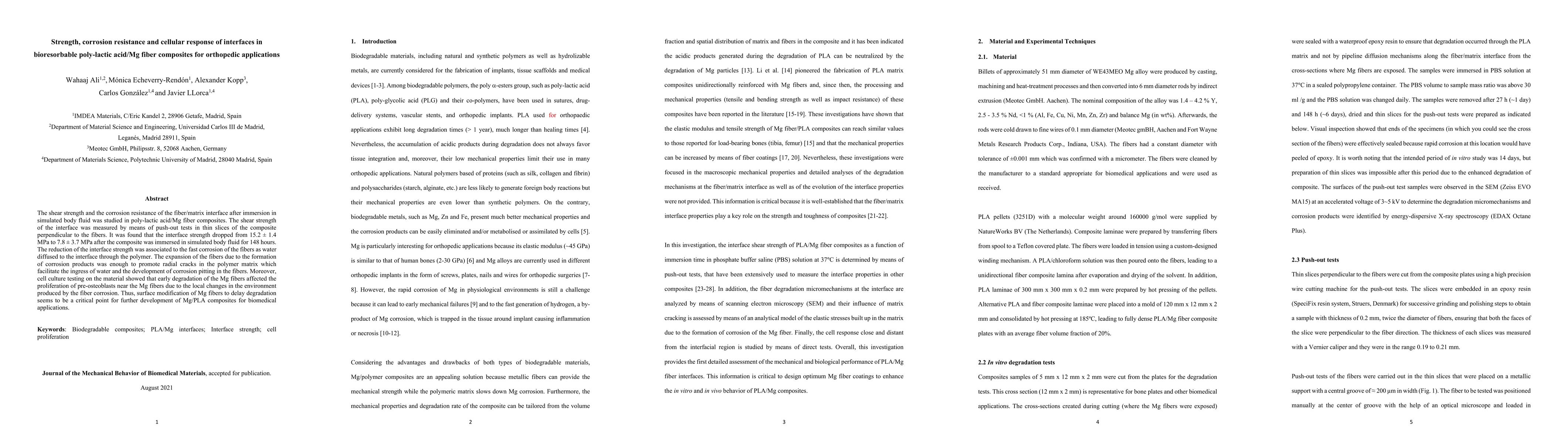This study investigates the shear strength and corrosion resistance of poly-lactic acid/Mg fiber composite interfaces, finding a significant drop in interface strength due to Mg fiber corrosion. Early degradation of Mg fibers negatively impacts pre-osteoblast proliferation, highlighting the need for surface modification to improve composite performance for orthopedic applications.