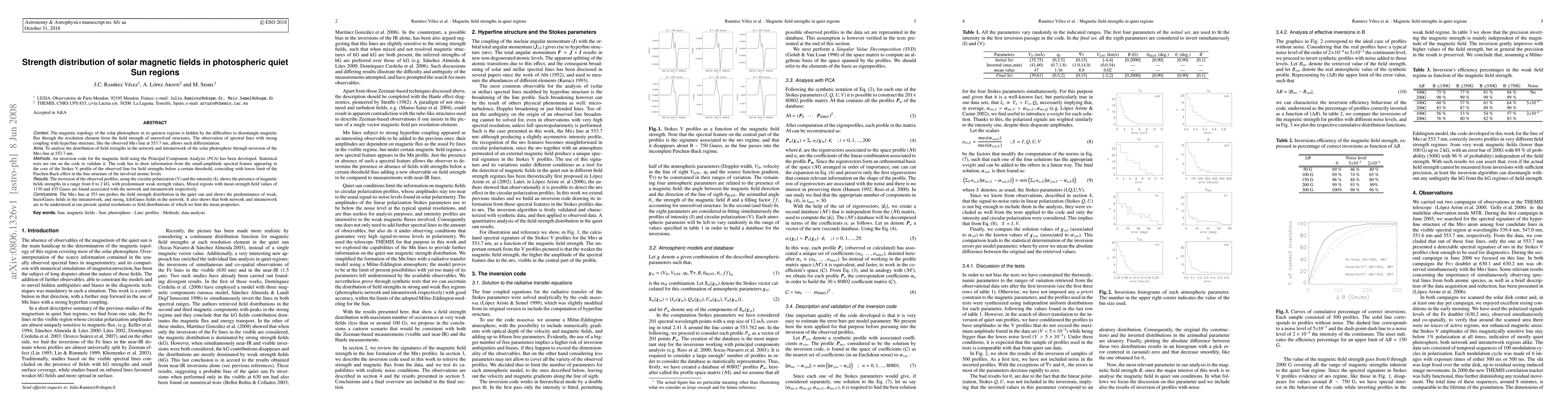 The magnetic topology of the solar photosphere in its quietest regions is hidden by the difficulties to disentangle magnetic flux through the resolution element from the field strength of unresolved structures. The observation of spectral lines with strong coupling with hyperfine structure, like the observed MnI line at 553.7 nm, allows such differentiation. The main aim is to analyse the distribution of field strengths in the network and intranetwork of the solar photosphere through inversion of the MnI line at 553.7 nm. An inversion code for the magnetic field using the Principal Component Analysis (PCA) has been developed. Statistical tests are run on the code to validate it. The code has to draw information from the small-amplitude spectral feature oppearing in the core of the Stokes V profile of the observed line for field strengths below a certain threshold, coinciding with lower limit of the Paschen-Back effect in the fine structure of the involved atomic levels. The inversion of the observed profiles, using the circular polarization (V) and the intensity (I), shows the presence of magnetic fields strengths in a range from 0 to 2 kG, with predominant weak strength values. Mixed regions with mean strength field values of 1130 and 435 Gauss are found associated with the network and intranetwork respectively. The MnI line at 553 nm probes the field strength distribution in the quiet sun and shows the predominance of weak, hectoGauss fields in the intranetwork, and strong, kiloGauss fields in the network. It also shows that both network and intranetwork are to be understood at our present spatial resolutions as field distributions of which we hint the mean properties.