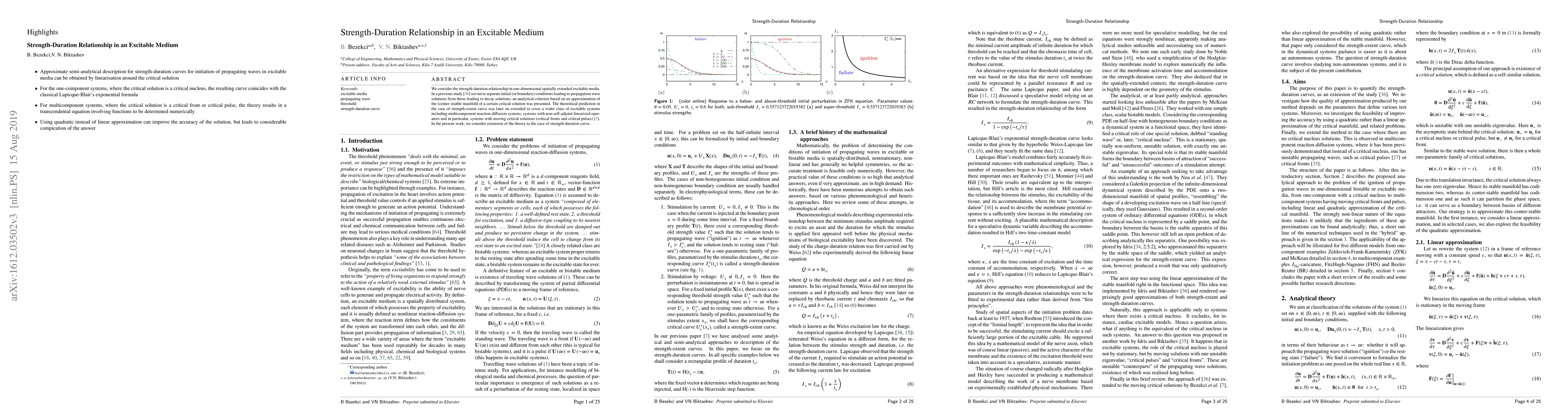 We consider the strength-duration relationship in one-dimensional spatially extended excitable media. In a previous study [Idris and Biktashev 2008] set out to separate initial (or boundary) conditions leading to propagation wave solutions from those leading to decay solutions, an analytical criterion based on an approximation of the (center-)stable manifold of a certain critical solution was presented. The theoretical prediction in the case of strength-extent curve was later on extended to cover a wider class of excitable systems including multicomponent reaction-diffusion systems, systems with non-self-adjoint linearized operators and in particular, systems with moving critical solutions (critical fronts and critical pulses) [Bezekci et al. 2015]. In the present work, we consider extension of the theory to the case of strength-duration curve.