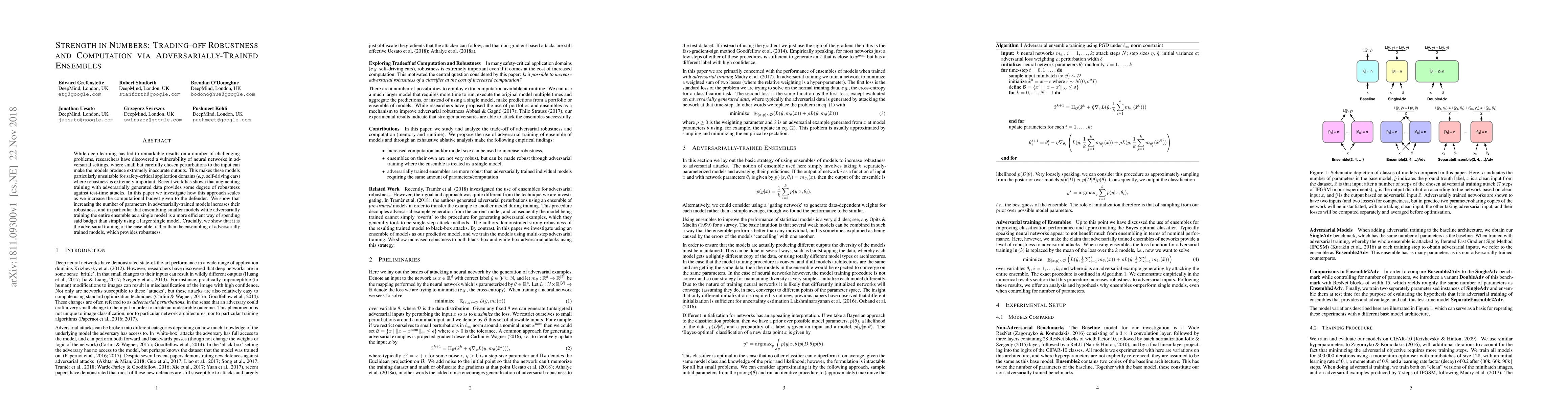 While deep learning has led to remarkable results on a number of challenging problems, researchers have discovered a vulnerability of neural networks in adversarial settings, where small but carefully chosen perturbations to the input can make the models produce extremely inaccurate outputs. This makes these models particularly unsuitable for safety-critical application domains (e.g. self-driving cars) where robustness is extremely important. Recent work has shown that augmenting training with adversarially generated data provides some degree of robustness against test-time attacks. In this paper we investigate how this approach scales as we increase the computational budget given to the defender. We show that increasing the number of parameters in adversarially-trained models increases their robustness, and in particular that ensembling smaller models while adversarially training the entire ensemble as a single model is a more efficient way of spending said budget than simply using a larger single model. Crucially, we show that it is the adversarial training of the ensemble, rather than the ensembling of adversarially trained models, which provides robustness.