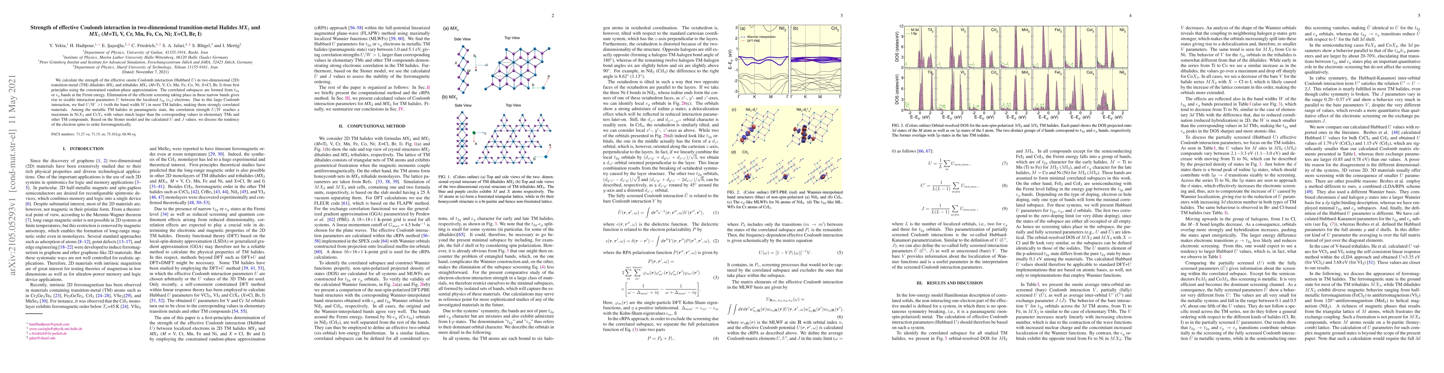 This study calculates the effective Coulomb interaction (Hubbard $U$) in 2D transition-metal dihalides MX$_2$ and trihalides MX$_3$ using first-principles methods. It finds that $U/W > 1$ in most materials, indicating strong electron correlation, with the highest correlation strength in NiX$_2$ and CrX$_3$. The study also discusses the potential for ferromagnetic spin ordering based on calculated $U$ and $J$ values.