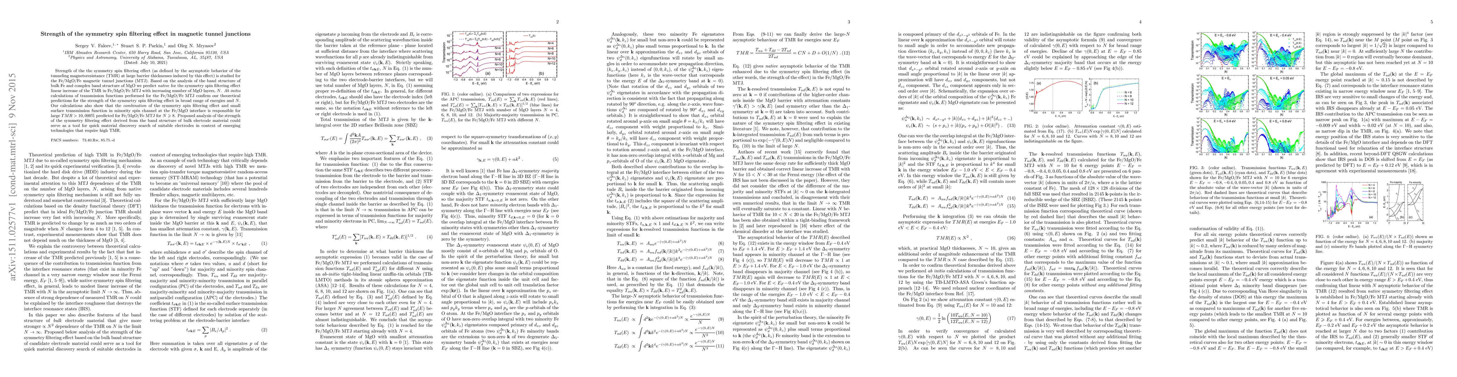 Strength of the the symmetry spin filtering effect (as defined by the asymptotic behavior of the tunneling magnetoresistance (TMR) at large barrier thicknesses induced by this effect) is studied for the Fe/MgO/Fe magnetic tunnel junctions (MTJ). Based on the analysis of the band structure of bulk Fe and complex band structure of MgO we predict \emph{native} for the symmetry spin filtering effect linear increase of the TMR in Fe/MgO/Fe MTJ with increasing number of MgO layers, $N$. \emph{Ab initio} calculations of transmission functions performed for the Fe/MgO/Fe MTJ confirm our theoretical predictions for the strength of the symmetry spin filtering effect in broad range of energies and $N$. Our calculations also show that the \emph{combination} of the symmetry spin filtering effect and small surface transmission function in minority spin channel at the Fe/MgO interface is responsible for large $TMR>10,000\%$ predicted for Fe/MgO/Fe MTJ for $N \geqslant 8$. Proposed analysis of the strength of the symmetry filtering effect derived from the band structure of bulk electrode material could serve as a tool for quick material discovery search of suitable electrodes in context of emerging technologies that require high TMR.