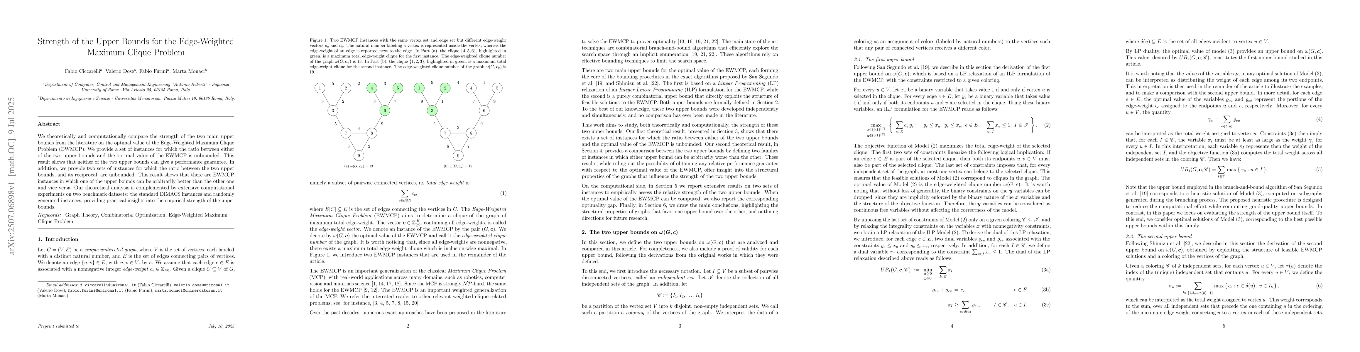 We theoretically and computationally compare the strength of the two main upper bounds from the literature on the optimal value of the Edge-Weighted Maximum Clique Problem (EWMCP). We provide a set of instances for which the ratio between either of the two upper bounds and the optimal value of the EWMCP is unbounded. This result shows that neither of the two upper bounds can give a performance guarantee. In addition, we provide two sets of instances for which the ratio between the two upper bounds, and its reciprocal, are unbounded. This result shows that there are EWMCP instances in which one of the upper bounds can be arbitrarily better than the other one and vice versa. Our theoretical analysis is complemented by extensive computational experiments on two benchmark datasets: the standard DIMACS instances and randomly generated instances, providing practical insights into the empirical strength of the upper bounds.