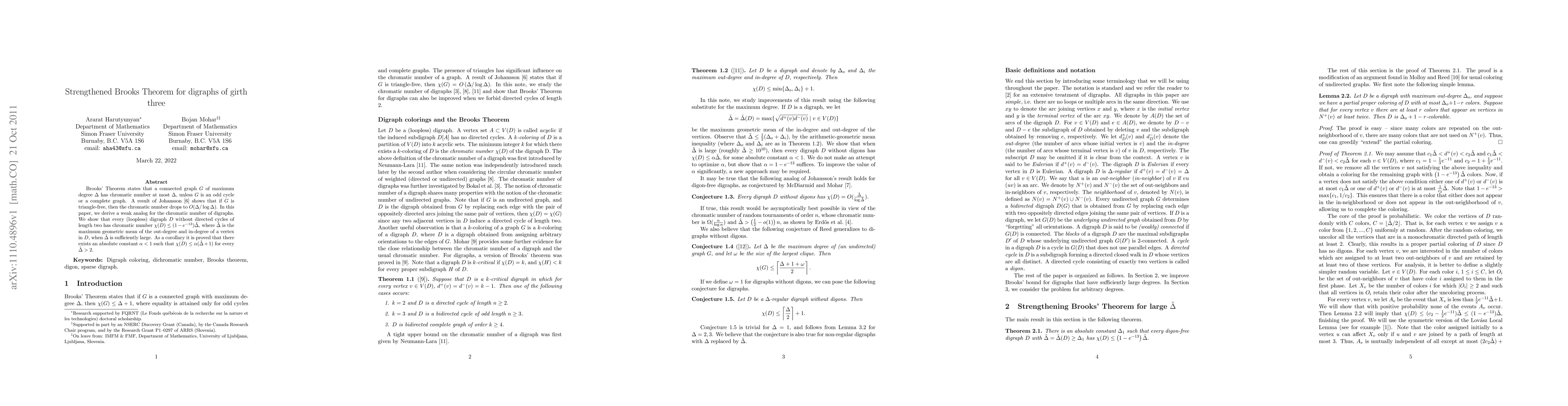 Brooks' Theorem states that a connected graph $G$ of maximum degree $\Delta$ has chromatic number at most $\Delta$, unless $G$ is an odd cycle or a complete graph. A result of Johansson (1996) shows that if $G$ is triangle-free, then the chromatic number drops to $O(\Delta / \log \Delta)$. In this paper, we derive a weak analog for the chromatic number of digraphs. We show that every (loopless) digraph $D$ without directed cycles of length two has chromatic number $\chi(D) \leq (1-e^{-13}) \tilde{\Delta}$, where $\tilde{\Delta}$ is the maximum geometric mean of the out-degree and in-degree of a vertex in $D$, when $\tilde{\Delta}$ is sufficiently large. As a corollary it is proved that there exists an absolute constant $\alpha < 1$ such that $\chi(D) \leq \alpha (\tilde{\Delta} + 1)$ for every $\tilde{\Delta} > 2$.