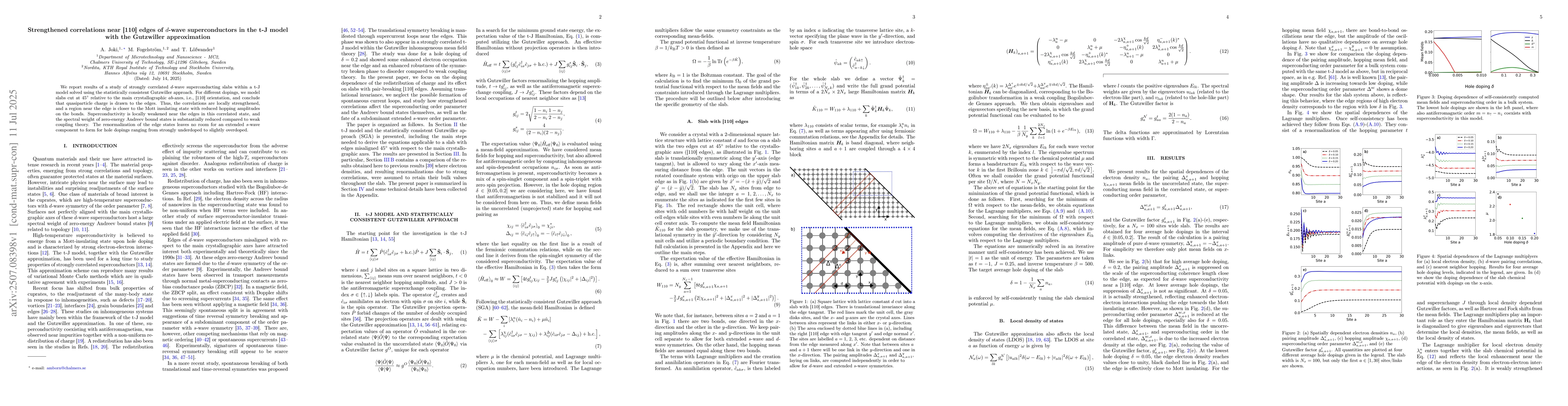 We report results of a study of strongly correlated $d$-wave superconducting slabs within a t-J model solved using the statistically consistent Gutzwiller approach. For different dopings, we model slabs cut at 45$^\circ$ relative to the main crystallographic $ab$-axes, i.e., [110] orientation, and conclude that quasiparticle charge is drawn to the edges. Thus, the correlations are locally strengthened, and a region near the edge is closer to the Mott insulating state with reduced hopping amplitudes on the links. Superconductivity is locally weakened near the edges in the correlated state, and the spectral weight of zero-energy Andreev bound states is substantially reduced compared to weak coupling theory. The renormalization of the edge states leaves no room for an extended $s$-wave component to form for hole dopings ranging from strongly underdoped to slightly overdoped.