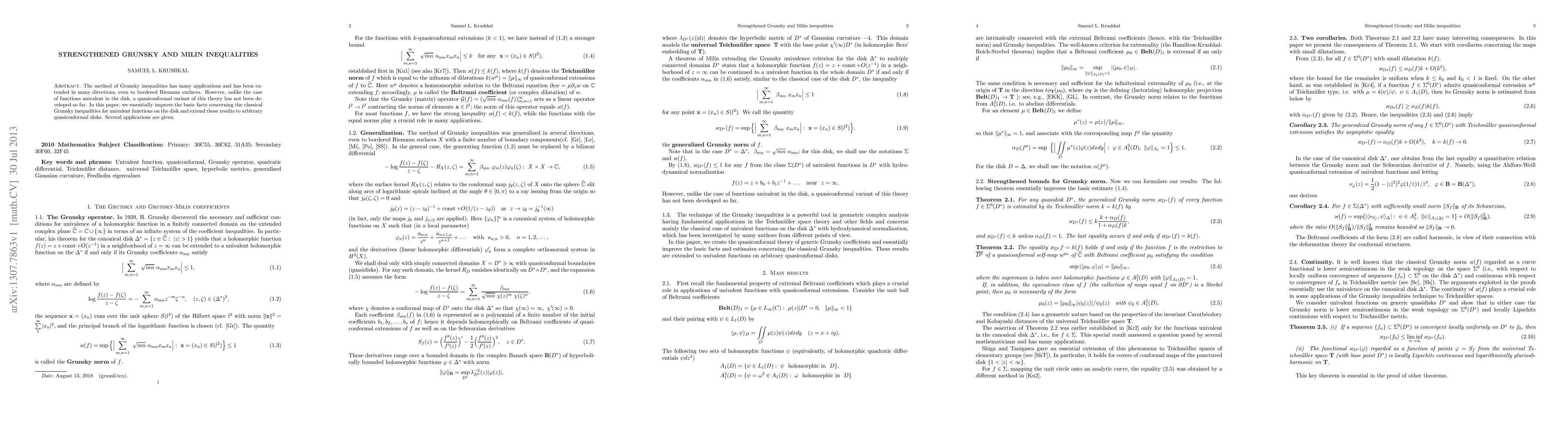 This paper enhances classical Grunsky inequalities for univalent functions on the disk and extends these improvements to quasiconformal disks, providing several applications of the strengthened results.