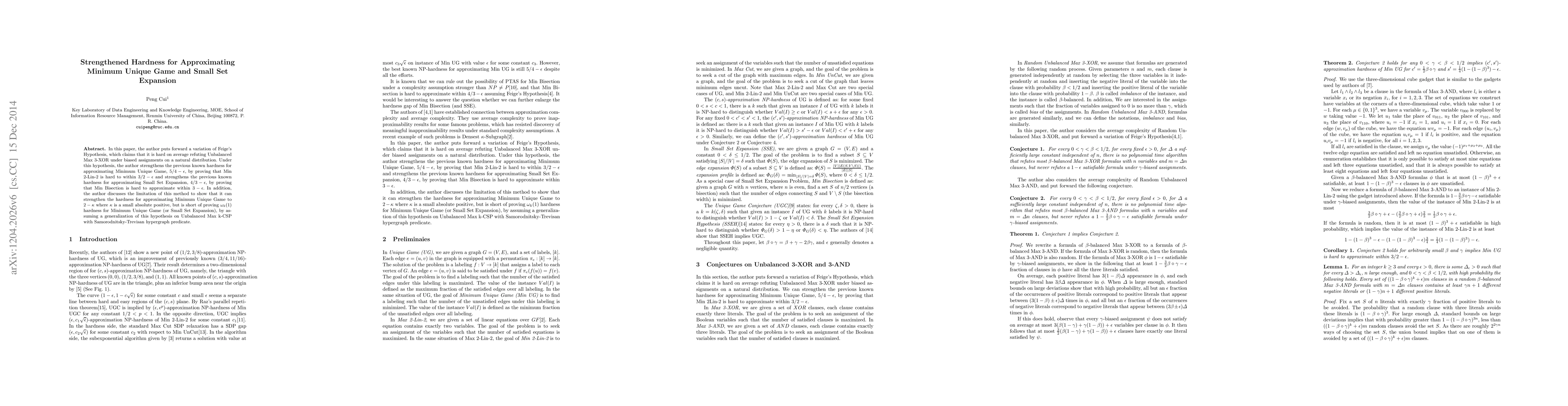 In this paper, the author puts forward a variation of Feige's Hypothesis, which claims that it is hard on average refuting Unbalanced Max 3-XOR under biased assignments on a natural distribution. Under this hypothesis, the author strengthens the previous known hardness for approximating Minimum Unique Game, $5/4-\epsilon$, by proving that Min 2-Lin-2 is hard to within $3/2-\epsilon$ and strengthens the previous known hardness for approximating Small Set Expansion, $4/3-\epsilon$, by proving that Min Bisection is hard to approximate within $3-\epsilon$. In addition, the author discusses the limitation of this method to show that it can strengthen the hardness for approximating Minimum Unique Game to $2-\kappa$ where $\kappa$ is a small absolute positive, but is short of proving $\omega_k(1)$ hardness for Minimum Unique Game (or Small Set Expansion), by assuming a generalization of this hypothesis on Unbalanced Max k-CSP with Samorodnitsky-Trevisan hypergraph predicate.