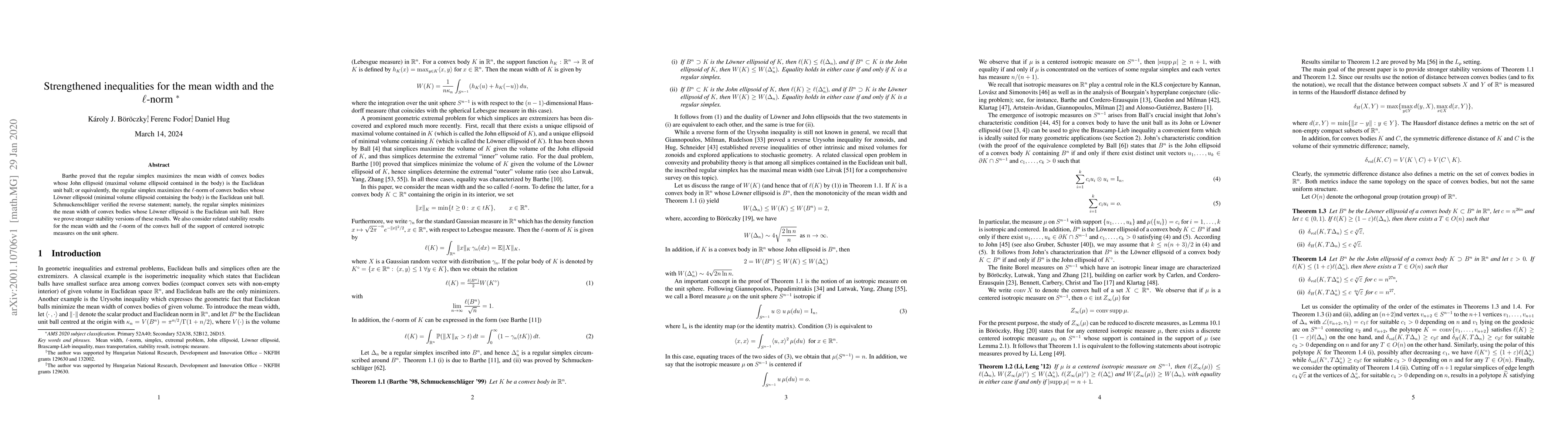 This paper strengthens inequalities for mean width and $ au$-norm of convex bodies in relation to their John and L"owner ellipsoids, respectively.