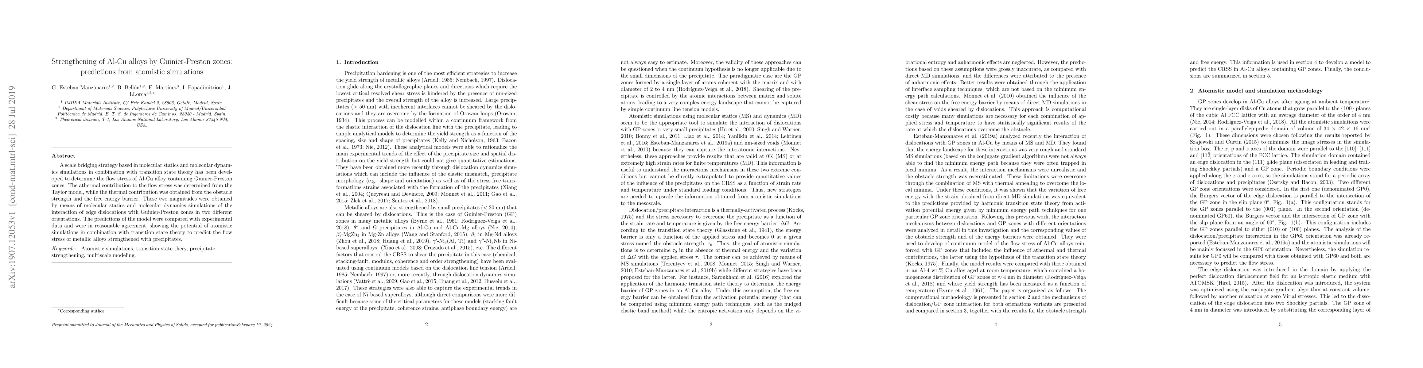 This study combines molecular statics and dynamics simulations with transition state theory to predict flow stress in Al-Cu alloys strengthened by Guinier-Preston zones. Results align with experimental data, demonstrating the potential of atomistic simulations in forecasting alloy mechanical properties.