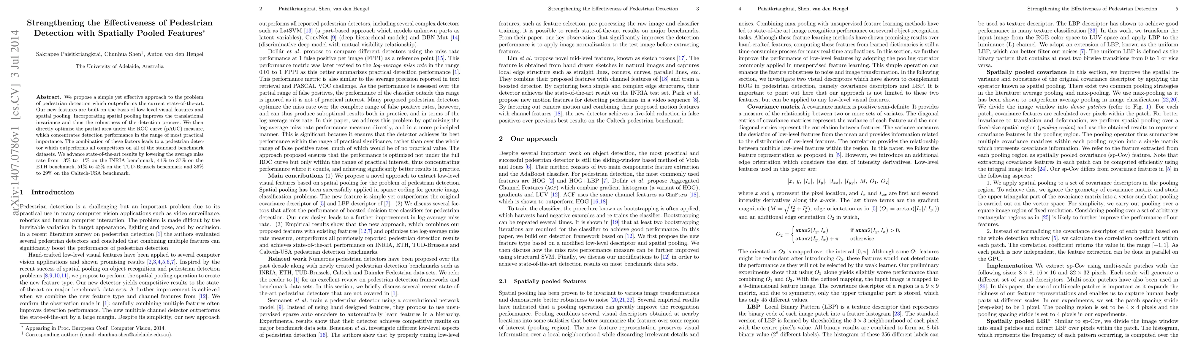 This paper proposes a pedestrian detection method that leverages spatially pooled features to enhance robustness and translational invariance, optimizing the partial area under the ROC curve (\pAUC) for practical detection performance. The new approach significantly improves detection accuracy across multiple benchmarks, reducing the average miss rate by up to 20%.