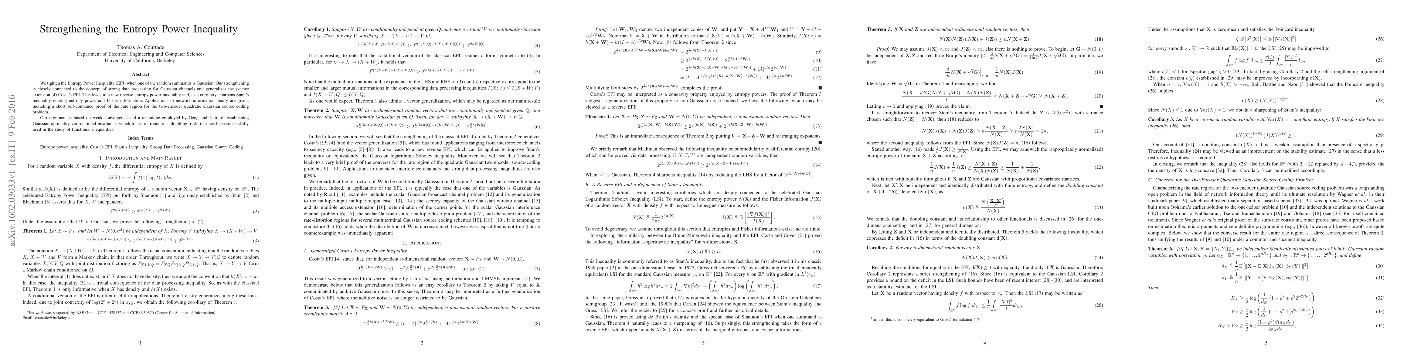 This paper strengthens the Entropy Power Inequality (EPI) for Gaussian random variables, connecting it to strong data processing in Gaussian channels. The new reverse EPI sharpens Stam's inequality and has applications in network information theory, including a proof of the rate region for the two-encoder quadratic Gaussian source coding problem. The method uses weak convergence and rotational-invariance techniques.