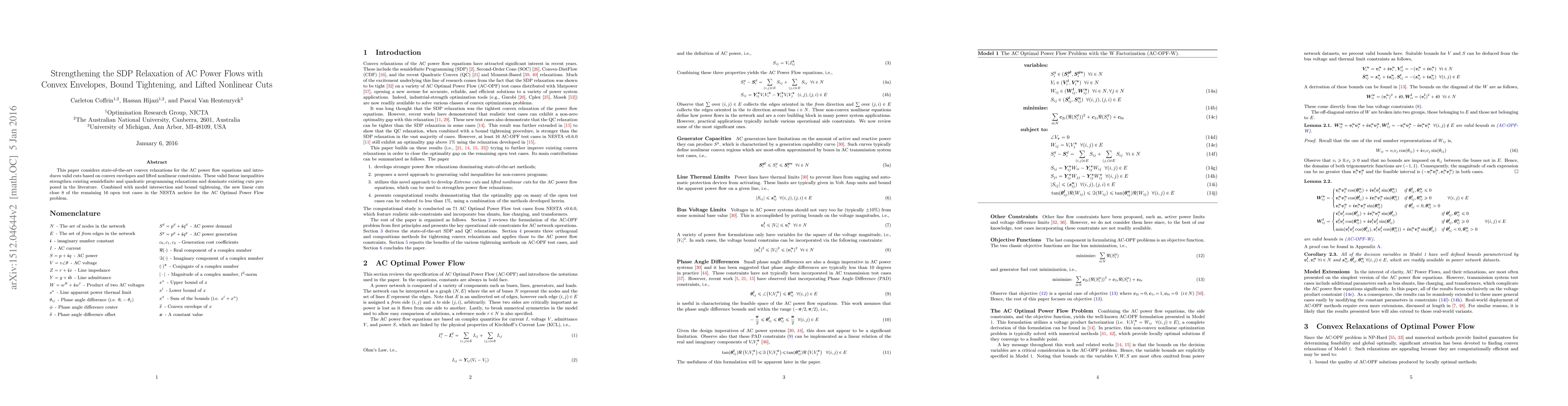 This paper enhances convex relaxations for AC power flow equations using new valid linear cuts based on convex envelopes and lifted nonlinear constraints, which improve existing semidefinite and quadratic programming relaxations and close 8 of the 16 open test cases in the NESTA archive for the AC Optimal Power Flow problem.