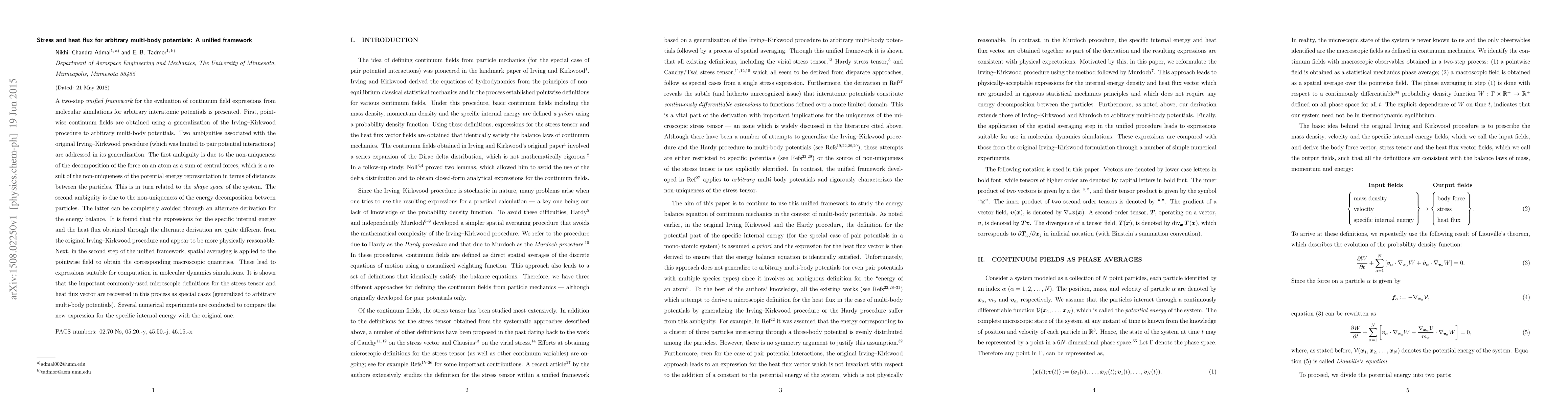 A two-step unified framework for the evaluation of continuum field expressions from molecular simulations for arbitrary interatomic potentials is presented. First, pointwise continuum fields are obtained using a generalization of the Irving-Kirkwood procedure to arbitrary multi-body potentials. Two ambiguities associated with the original Irving-Kirkwood procedure (which was limited to pair potential interactions) are addressed in its generalization. The first ambiguity is due to the non-uniqueness of the decomposition of the force on an atom as a sum of central forces, which is a result of the non-uniqueness of the potential energy representation in terms of distances between the particles. This is in turn related to the shape space of the system. The second ambiguity is due to the non-uniqueness of the energy decomposition between particles. The latter can be completely avoided through an alternate derivation for the energy balance. It is found that the expressions for the specific internal energy and the heat flux obtained through the alternate derivation are quite different from the original Irving-Kirkwood procedure and appear to be more physically reasonable. Next, in the second step of the unified framework, spatial averaging is applied to the pointwise field to obtain the corresponding macroscopic quantities. These lead to expressions suitable for computation in molecular dynamics simulations. It is shown that the important commonly-used microscopic definitions for the stress tensor and heat flux vector are recovered in this process as special cases (generalized to arbitrary multi-body potentials). Several numerical experiments are conducted to compare the new expression for the specific internal energy with the original one.