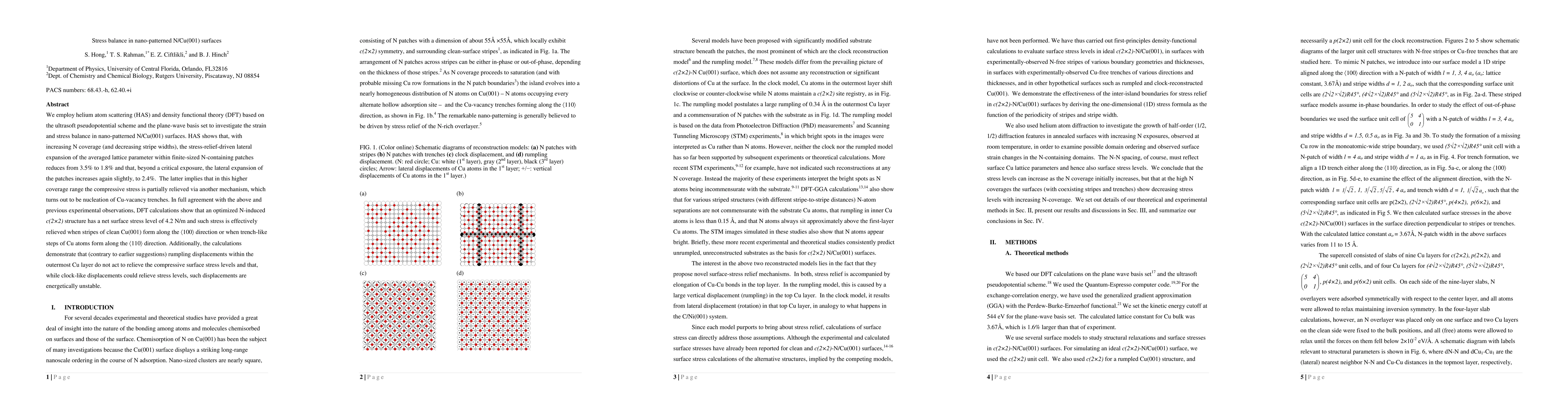 We employ helium atom scattering (HAS) and density functional theory (DFT) based on the ultrasoft pseudopotential scheme and the plane-wave basis set to investigate the strain and stress balance in nano-patterned N/Cu(001) surfaces. HAS shows that, with increasing N coverage (and decreasing stripe widths), the stress-relief-driven lateral expansion of the averaged lattice parameter within finite-sized N-containing patches reduces from 3.5% to 1.8% and that, beyond a critical exposure, the lateral expansion of the patches increases again slightly, to 2.4%. The latter implies that in this higher coverage range the compressive stress is partially relieved via another mechanism, which turns out to be nucleation of Cu-vacancy trenches. In full agreement with the above and previous experimental observations, DFT calculations show that an optimized N-induced c(2\times2) structure has a net surface stress level of 4.2 N/m and such stress is effectively relieved when stripes of clean Cu(001) form along the <100> direction or when trench-like steps of Cu atoms form along the <110> direction. Additionally, the calculations demonstrate that (contrary to earlier suggestions) rumpling displacements within the outermost Cu layer do not act to relieve the compressive surface stress levels and that, while clock-like displacements could relieve stress levels, such displacements are energetically unstable.